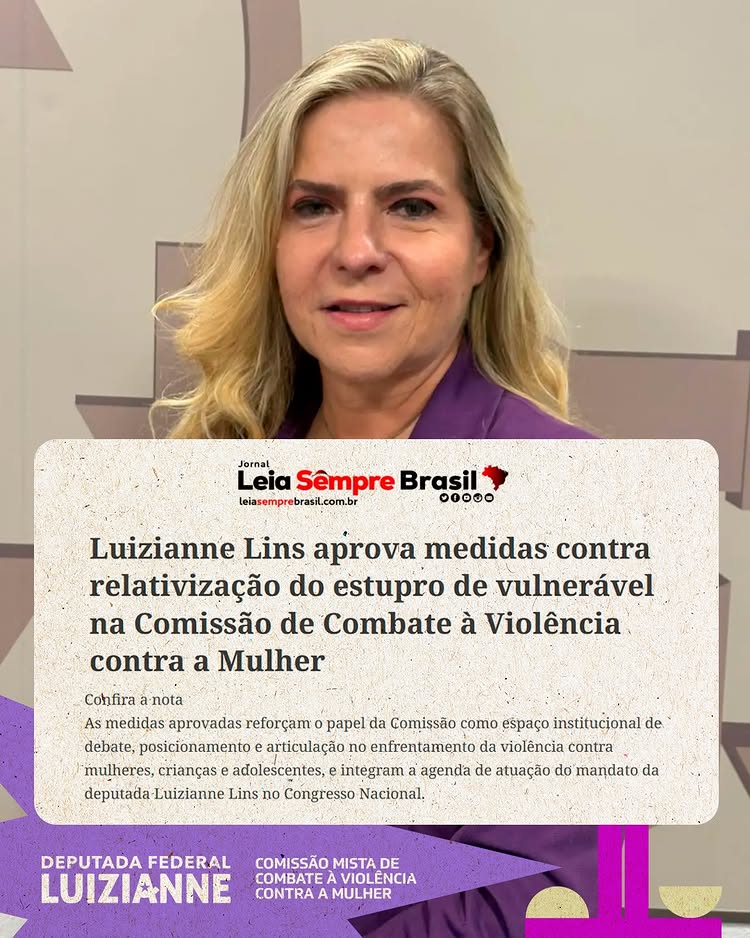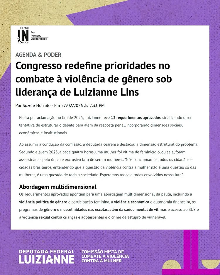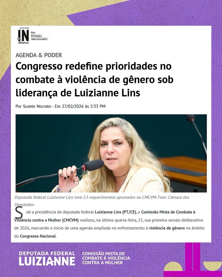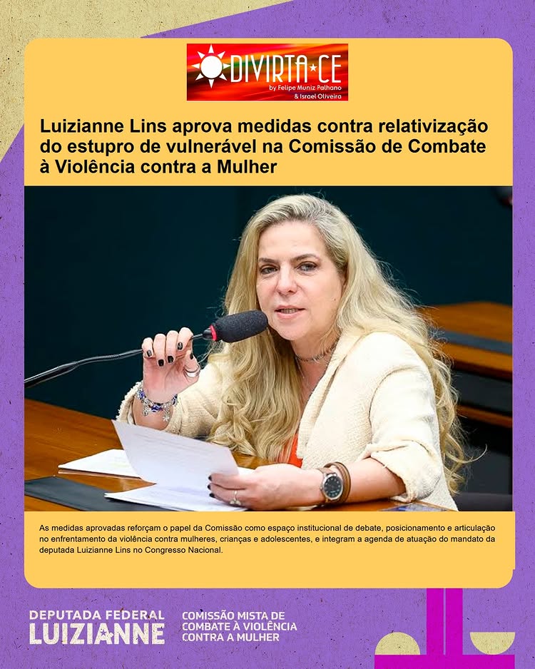 A Comissão Mista de Combate à Violência Contra a Mulher (CMCVM), do Congresso Nacional, presidida pela deputada federal Luizianne Lins, aprovou 13 medidas para debater e enfrentar o feminicídio, a violência contra as mulheres e meninas, a pedofilia, a violência política de gênero, entre outros temas. “As medidas aprovadas reforçam o papel da Comissão como espaço institucional de debate, posicionamento e articulação no enfrentamento da violência contra mulheres, crianças e adolescentes, e integram a agenda de atuação do nosso mandato no Congresso Nacional”, assinalou a parlamentar.