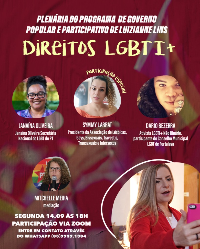 Pessoas ligadas ao movimento LGBTI+ apoiadores da candidata pelo PT à Prefeitura de Fortaleza, Luizianne Lins, realizaram plenária, no último dia 14/09, para construir propostas para o Programa de Governo Popular e Participativo. Nas exposições, foi relatado o desmonte da política LGBT em Fortaleza e sua transversalidade, desarticulando-se, assim, da rede integrada de proteção e promoção da população LGBT. Na gestão Luizianne, a rede contava com Assistência Social, Saúde, Educação e Direitos Humanos como as principais articuladoras da política) em Fortaleza.