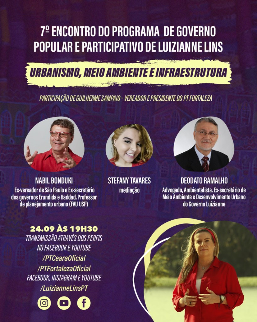 Participaram das discussões os convidados Nabil Bonduki, arquiteto, professor titular de Planejamento Urbano da Universidade de São Paulo (USP) e ex-secretário das gestões Erundina e Haddad em SP; e o advogado, ambientalista, ex-vereador e ex-secretário de Meio Ambiente e Desenvolvimento Urbano na gestão Luizianne em Fortaleza, Deodato Ramalho. O candidato a vice na chapa de Luizianne, Vladyson Viana, também participou do debate.