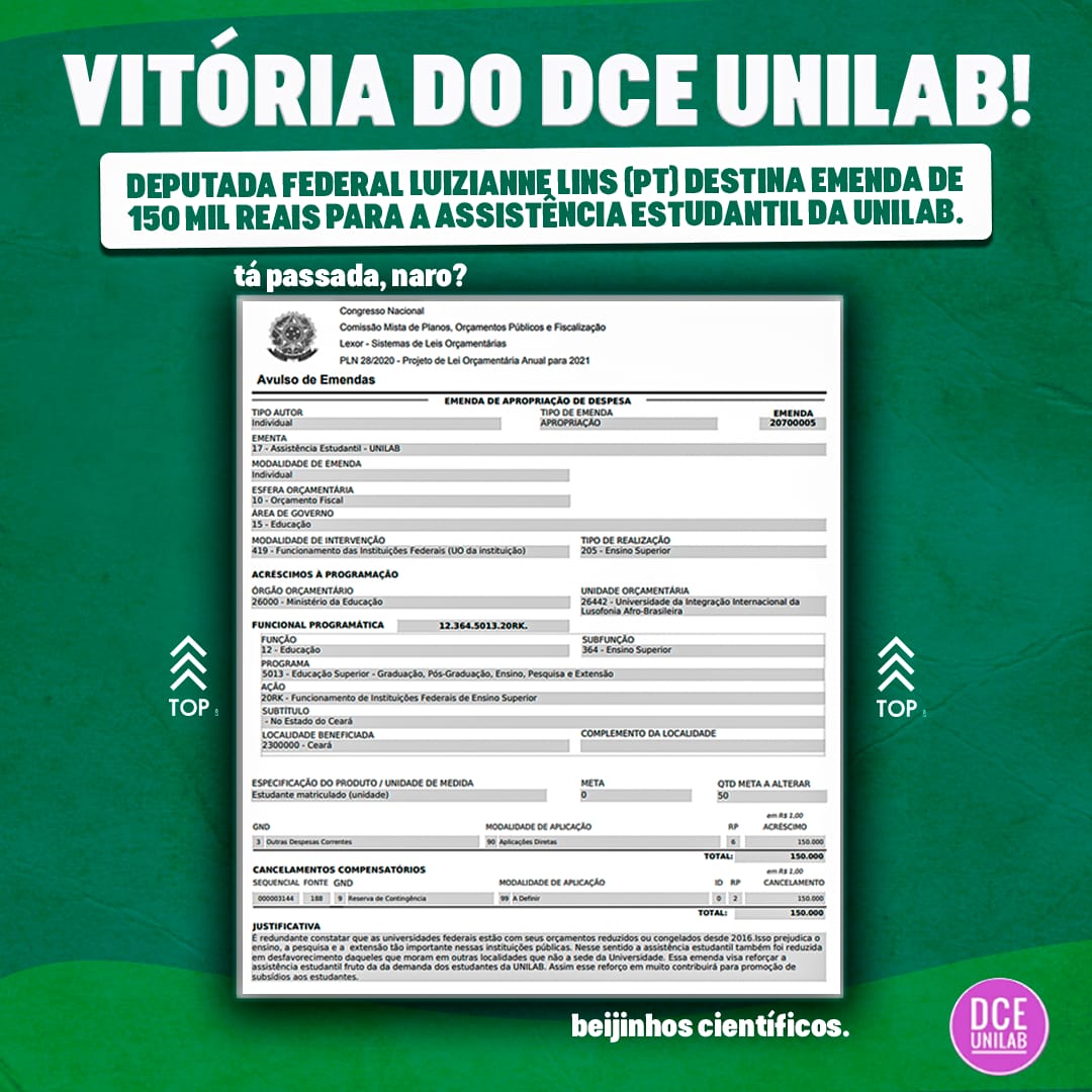 Juntamente com o Diretório Central do Estudantes (DCE) da Unilab o mandato da deputada articulou uma emenda no valor de 150 mil reais para a Assistência Estudantil da universidade. O dinheiro já está no caixa da instituição para ser executada.