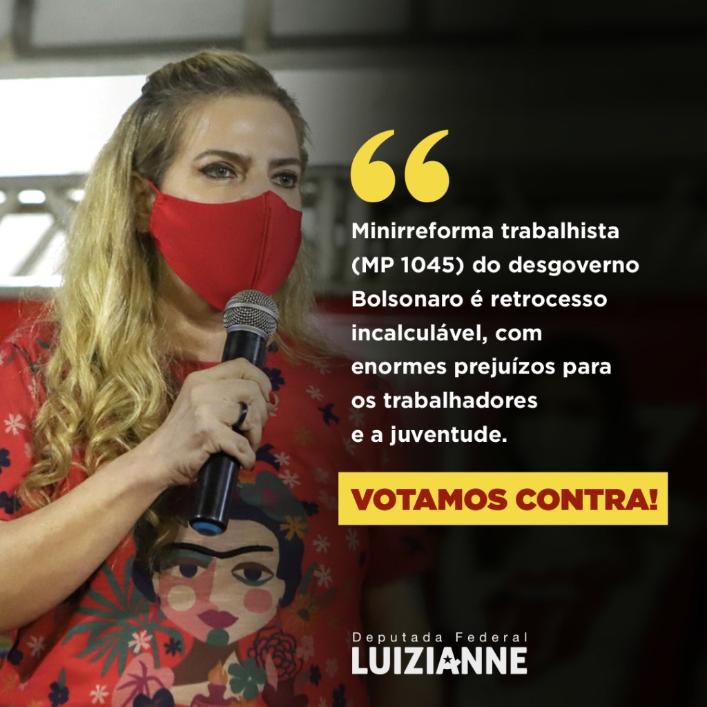 A deputada federal Luizianne Lins (PT/CE) votou juntamente com a bancada do PT na Câmara Federal contra a Medida Provisória (MP) nº 1045, do desgoverno Bolsonaro, também chamada de minirreforma trabalhista. “Essa MP [já aprovada na Câmara] é um retrocesso incalculável, com enormes perdas para os/as trabalhadores/as e a juventude”, afirmou a parlamentar em suas redes sociais. A MP está agora tramitando no Senado.