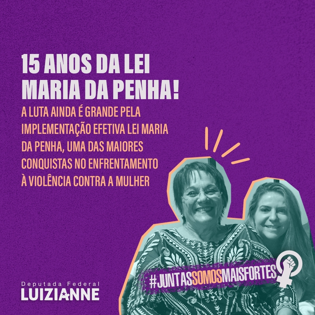 A deputada federal Luizianne Lins (PT/CE) enfatizou em suas redes sociais da Internet, neste mês de agosto de 2021, os 15 anos de criação da Lei Maria da Penha. Ela destacou também os desafios ainda a serem superados para a implementação efetiva da Lei, que “é uma das maiores conquistas no enfrentamento à violência contra a mulher no Brasil”. Viva a Lei Maria da Penha. Seguimos na luta contra o machismo, a violência e toda forma de opressão”.