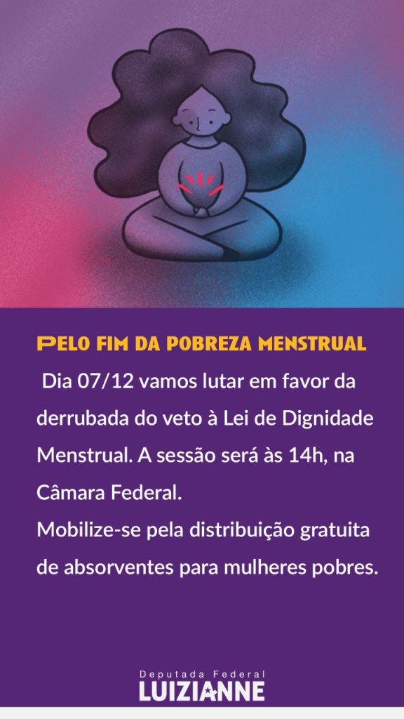A deputada federal Luizianne Lins (PT/CE) tem se somado à campanha pela derrubada do veto nº 59 de Bolsonaro à Lei nº 14214/21, de autoria da deputada Marília Arraes (PT/PE) e subscrita pela bancada do PT na Câmara. A lei foi aprovada na Câmara e no Senado, mas o presidente vetou. “Vamos todas/os/es nos somar à luta pelo fim da pobreza menstrual e derrubar na Câmara veto de Bolsonaro à lei para distribuir absorventes a mulheres e meninas em situação de vulnerabilidade”, afirmou Luizianne em suas redes sociais da Internet.