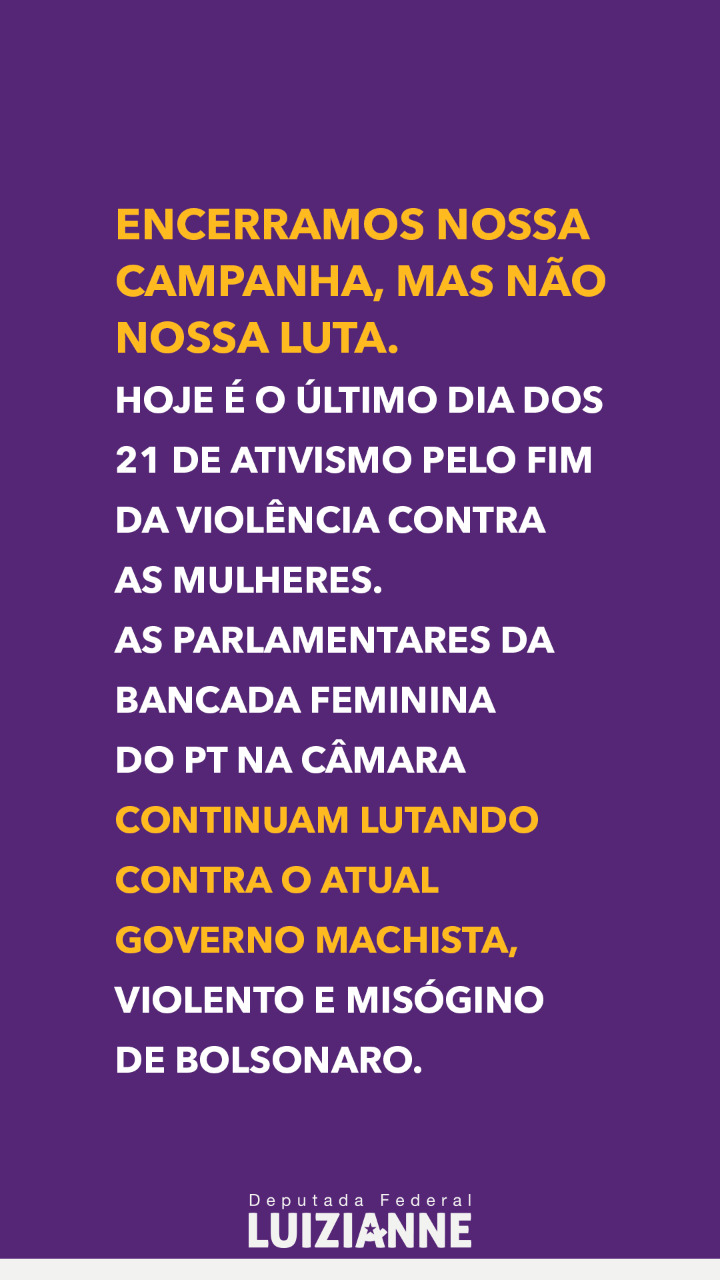 Luizianne assinala ainda: “Encerramos nossa campanha, mas não nossa luta. 10/12 é o último dia dos 21 de Ativismo pelo Fim da Violência Contra as Mulheres. As parlamentares da bancada feminina do PT na Câmara continuam lutando contra o atual governo machista, violento e misógino de Bolsonaro”.