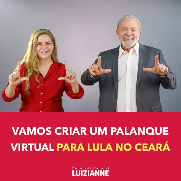 A deputada federal Luizianne Lins (PT/CE) lançou, neste final de 2021, uma campanha em suas redes sociais da Internet para a criação de um palanque virtual para o presidente Lula no Ceará. De acordo com a parlamentar, o povo quer Lula presidente outra vez, mas a luta ainda não está ganha. É preciso trabalhar cidade por cidade, estado por estado, dia após dia para fortalecer a candidatura de Lula. “Por isso, pedimos que construa com a gente um forte palanque virtual. Espalhe essa ideia. Vamos construir juntos um mundo melhor. Convide amigos para nos seguir nas nossas redes sociais oficiais”, afirma Luizianne.