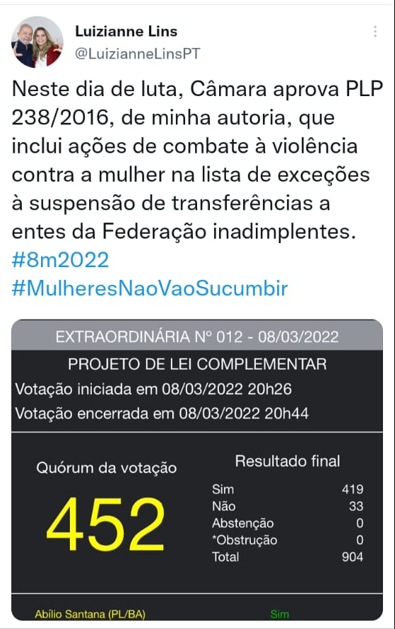 Com o voto favorável da Bancada do PT, a Câmara aprovou, na noite desta terça-feira, 08/03, Dia Internacional de Luta das Mulheres, o Projeto de Lei Complementar (PLP 238/16), de autoria da deputada federal Luizianne Lins (PT-CE), que muda a Lei de Responsabilidade Fiscal para garantir o repasse de recursos destinados a ações de combate à violência contra a mulher, mesmo quando houver restrições previstas nessa lei. “O principal objetivo é propiciar maior oferta de recursos a estados, municípios e ao Distrito Federal para que reforcem a sua atuação em ações de combate à violência contra a mulher”, justifica a deputada do PT cearense.
