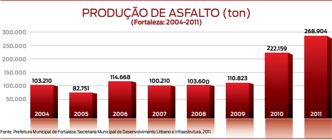 Diante da rápida expansão da frota, a manutenção da malha viária da cidade também tem exigido atenção especial da gestão. A evolução desse esforço pode ser medida pelo incremento constante da demanda de cobertura asfáltica. Em 2005, foram produzidas 82.751 toneladas de asfalto. Em 2011, o volume alcançou 268.904 toneladas. Ou seja, tivemos um incremento nesse período de 224,95% na produção, o que significou que o volume de produção mais que triplicou. Ao longo de sete anos, a produção acumulada resultou num total de mais de 1 milhão de toneladas de asfalto para expansão e manutenção da malha viária. Deste modo, a crescente ampliação da capacidade de produção mostra que a diferença entre o que tínhamos em 2004 e o que passamos a ter em 2011 é de mais de 165 mil toneladas. São números expressivos do trabalho da Prefeitura para garantir a qualidade do sistema viário da cidade.