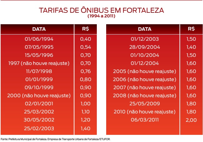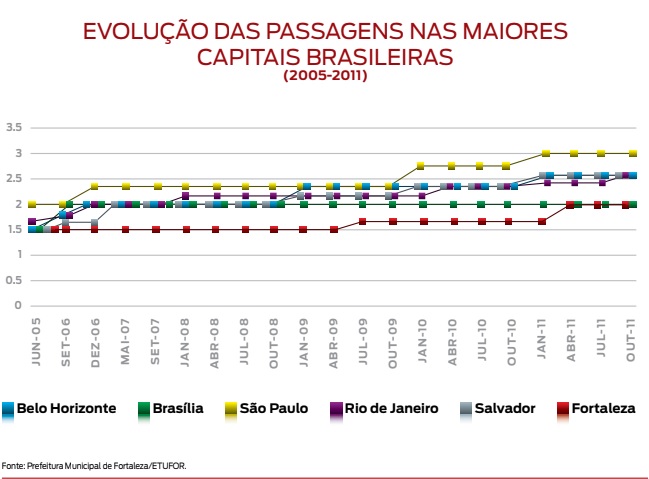 De 1994 a 2004, período anterior à gestão Luizianne Lins, a tarifa de ônibus em Fortaleza quadruplicou.De 2005 em diante, só ocorreram dois aumentos. Em 2011, com valor de R$ 2,00, Fortaleza permanece com a menor tarifa entre cidades do Brasil com mais de 1 milhão de habitantes e sistema integrado. De segunda a sábado, das 9 às 10 horas e das 15 às 16 horas, temos a hora social, na qual a passagem permanece R$ 1,80 para os portadores do vale-transporte eletrônico e R$ 0,90 para estudantes com carteira. Fortaleza é também a única capital do país onde a meia é ilimitada para a rede pública e particular. Além disso, a Prefeitura garante a gratuidade da carteira de estudante para todos os alunos da rede pública (municipal, estadual e federal).