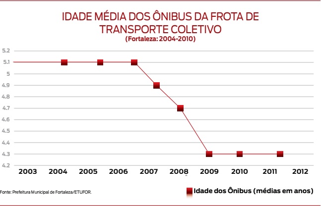 Foram mais de 1.200 veículos novos a partir de 2005. Isso significou mais conforto e segurança para os passageiros em geral, como também redução da poluição ambiental e a incorporação de tecnologias de acessibilidade (elevadores, assentos com marcação especial para deficientes, gestantes e idosos). A redução da idade média da frota de ônibus tornou-a uma das mais novas do país, como pode ser observado a partir da série de 2004 a 2011. Esta série está dividida em dois períodos. Entre 2004 e 2005, a frota manteve uma média de idade de 5,1 anos. Durante a gestão de Luizianne Lins, a política de renovação da frota inverteu essa tendência e, a partir de 2006, os resultados começaram a se materializar na diminuição da idade média dos ônibus, que caiu de 5,1 anos em 2006 para 4,9 anos, em 2007 e para 4,7 anos em 2008, até atingir a média de 4,3 anos, em 2009, mantendo-se nesse patamar até 2011.