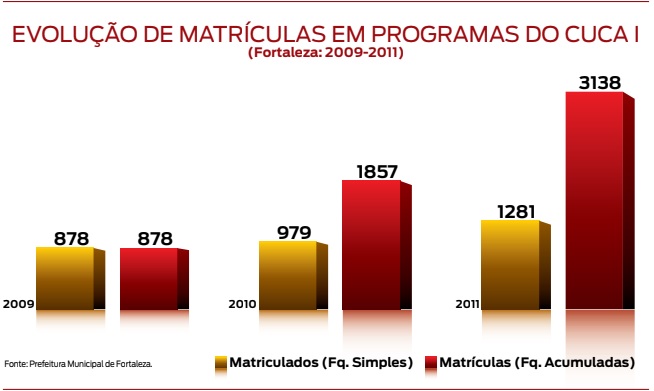 Além dos cursos, o CUCA é um espaço de oportunidades para nossos jovens, oferecendo uma programação cultural variada, com cinema e apresentações artísticas. O CUCA Che Guevara, inaugurado em setembro de 2009, matriculou desde então 3.138 alunos em atividades de formações diversas. Isso sem contar os eventos abertos, cuja participação de público é bem maior. Só no ano de 2011, até o final de junho, o CUCA I entregou certificados a 1.948 jovens. Coerente com sua política de descentralização e de acesso cultural à juventude, mais dois CUCAs estão sendo construídos nas Regionais V e VI, nos bairros Mondubim e São Cristóvão, correspondendo a um investimento total de R$ 17.618.096,00 entre 2007 e 2011. É a materialização das prioridades sociais da gestão de Luizianne Lins, cuidando com especial atenção das áreas e populações mais fragilizadas da cidade, promovendo políticas de equidade e combatendo todas as formas de exclusão.