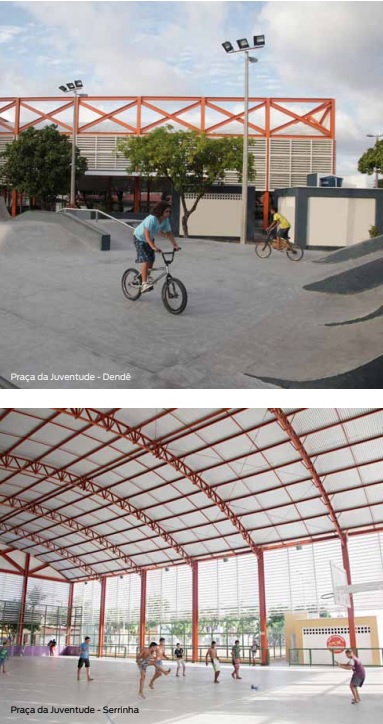As Praças da Juventude complementam a rede de espaços para juventude, estando em pleno funcionamento três delas: a Praça da Juventude do Dendê, no bairro Edson Queiroz (SER VI), a Praça da Juventude do Bonsucesso (SER III) e a Praça da Juventude da Serrinha (SER IV). Mais três Praças da Juventude estão projetadas: no bairro Messejana (SER VI); no Conjunto Polar (SER I); e na Granja Portugal (SER V). Dentre os equipamentos existentes nas Praças da Juventude, podemos enumerar os seguintes: quadra poliesportiva coberta; pista de skate; teatro de arena com 2 arquibancadas; campo de areia; vestiários; banheiros, acessibilidade; piso táctil em todo o perímetro da praça; quadra de areia e equipamentos de ginástica.