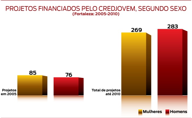 Incentivar a criatividade dos jovens também dá frutos econômicos. Por intermédio da concessão de empréstimos, centenas de jovens estão transformando sua criatividade em trabalho e renda. O programa CredJovem financia o desenvolvimento de empreendimentos solidários geridos por jovens. Além do crédito, o programa oferece capacitação, acompanhamento e consultoria. Parte do empréstimo (60%) é devolvida, sem o acréscimo de juros, para manter o fundo rotativo que financia novos jovens beneficiados. Para participar, os jovens, além de terem entre 18 e 29 anos, devem apresentar propostas com pelo menos dois integrantes, que tenham cursado pelo menos 50% de sua vida escolar em escola pública. Ao todo, o CredJovem beneficiou 354 jovens do sexo feminino e 359 do sexo masculino, totalizando 713 beneficiados. Entre 2005 e 2010, foram criados 391 novos empreendimentos pelos jovens de Fortaleza.