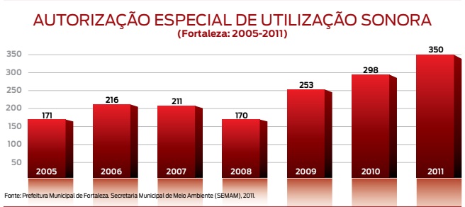 A questão ambiental em meio urbano exige constante processo de avaliação e controle de indicadores de qualidade ambiental. Nesse sentido, a Secretaria Municipal de Meio Ambiente (SEMAM) exerce atividades de fiscalização e monitoramento desses indicadores, que resultam na melhoria contínua da qualidade do meio ambiente no município de Fortaleza referente às poluições sonora, visual, hídrica, atmosférica e do solo. O controle da poluição sonora, por exemplo, é um importante indicador de educação ambiental e de convivência urbana. Assim, quando se observa a evolução dos números relativos à autorização especial de utilização sonora, fica evidente que as demandas da sociedade atinentes à poluição sonora tiveram considerável e consistente incremento no período entre 2005 e 2011, em 104,68%.