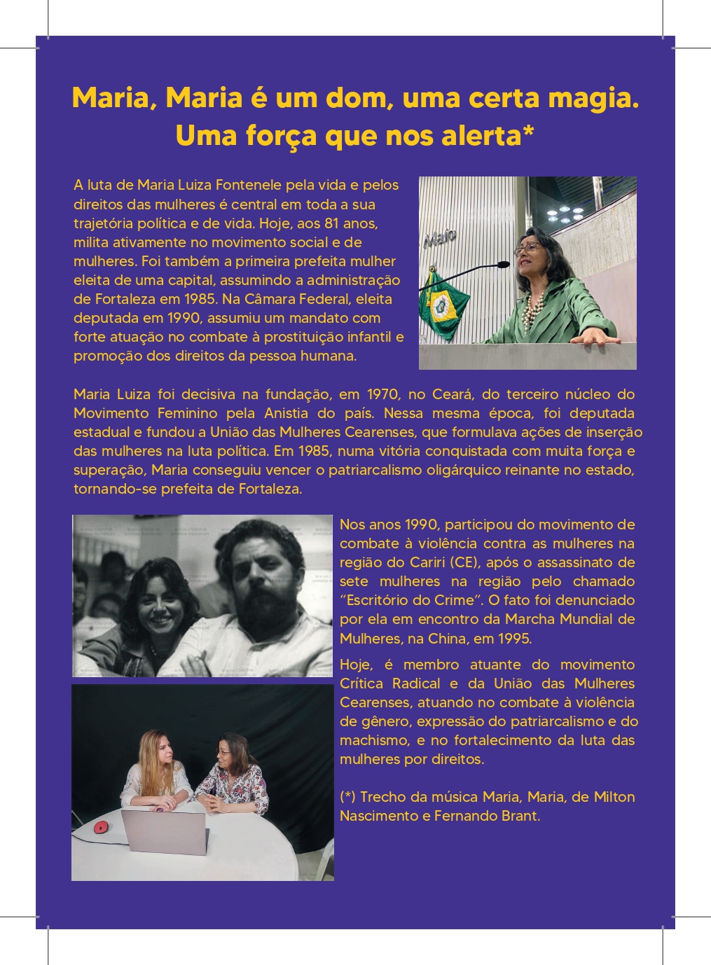 “Maria deixou a política partidária, mas segue firme e coerente na luta para mostrar que as mulheres devem ser protagonistas das lutas políticas e sociais. Hoje, ainda é membro atuante do movimento Crítica Radical e da União das Mulheres Cearenses, cujo objetivo central é enfrentar o sistema patriarcal capitalista em que o sujeito central é o macho ocidental branco”, afirma o material produzido pelo mandato de Luizianne.