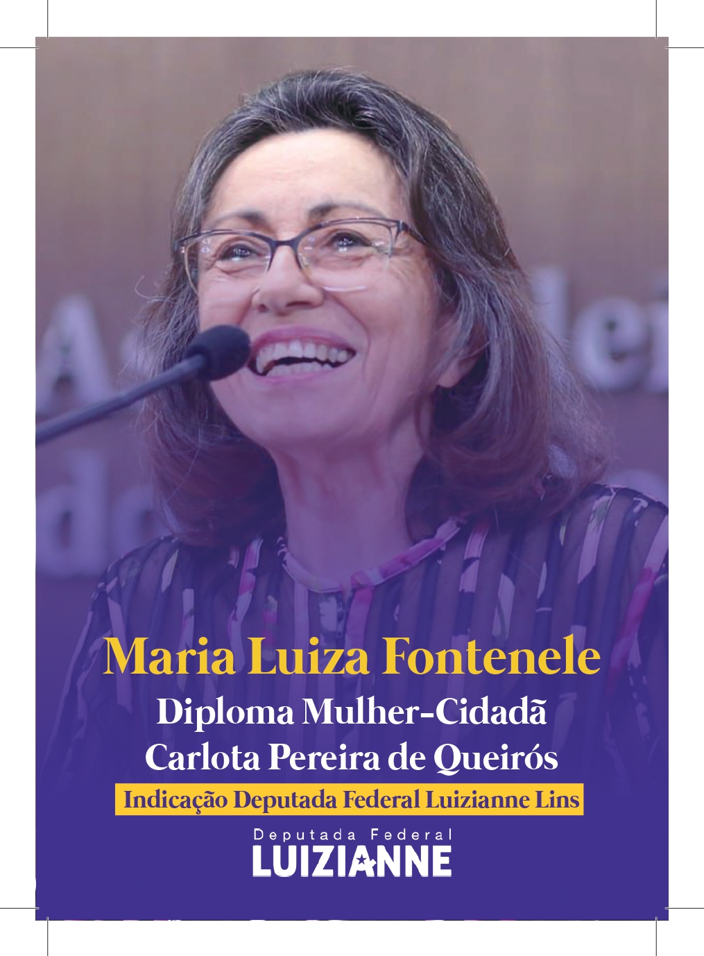 O mandato da deputada federal Luizianne Lins (PT/CE), presidente da Comissão de Direitos Humanos, Minorias e Igualdade Racial da Câmara, produziu material informativo para incentivar a indicação da ex-prefeita de Fortaleza Maria Luiza Fontenele ao prêmio Diploma Mulher Cidadã Carlota Pereira de Queirós.