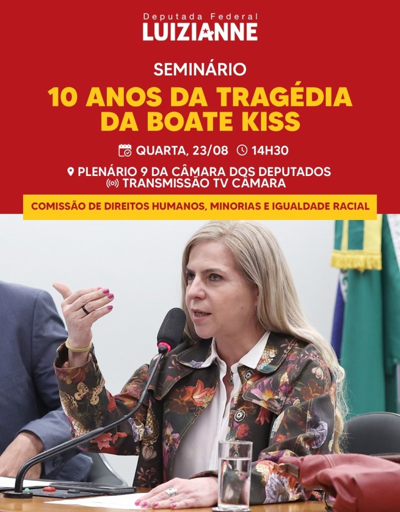 Por iniciativa da deputada federal Luizianne Lins (PT/CE), presidente da Comissão de Direitos Humanos, Minorias e Igualdade Racial da Câmara (CDHMIR), a CDHMIR realizará, nesta quarta-feira 23/08, às 14h30, seminário para debater os 10 anos da tragédia da boate Kiss, em Santa Maria/RS, que provocou a morte de 242 pessoas.