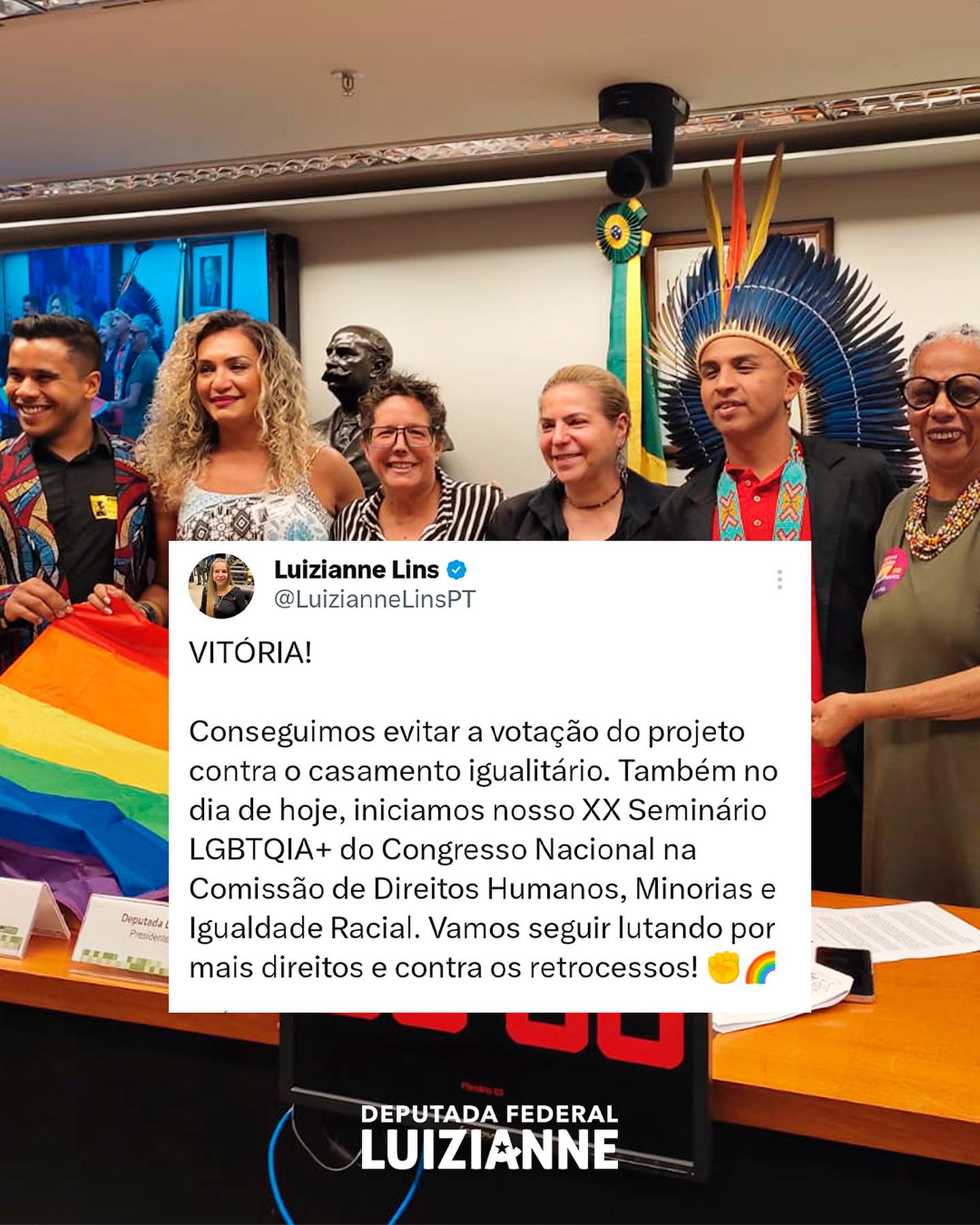 “VITÓRIA! Conseguimos evitar a votação do projeto contra o casamento igualitário. Também iniciamos nosso XX Seminário LGBTQIA+ do Congresso Nacional na Comissão de Direitos Humanos, Minorias e Igualdade Racial. Vamos seguir lutando por mais direitos e contra os retrocessos”, afirma a parlamentar.