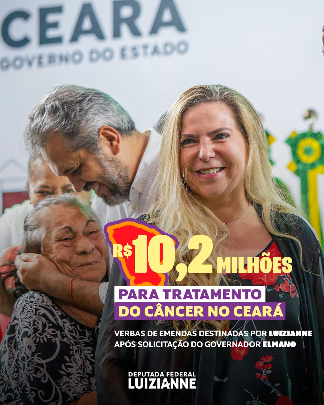A deputada federal Luizianne Lins (PT/CE), presidente da Comissão de Direitos Humanos, Minorias e Igualdade Racial da Câmara (CDHMIR), destinou, por meio de sua cota de emendas de bancada, mais de R$ 10 milhões para a saúde no Ceará. O recurso foi indicado após solicitação do governador do Ceará, Elmano de Freitas, para que os e as parlamentares do Ceará destinassem ao menos 50% de suas emendas de bancada para o programa estadual de tratamento do câncer. O valor representa mais de 80% do montante de emendas de bancada à disposição de Luizianne.