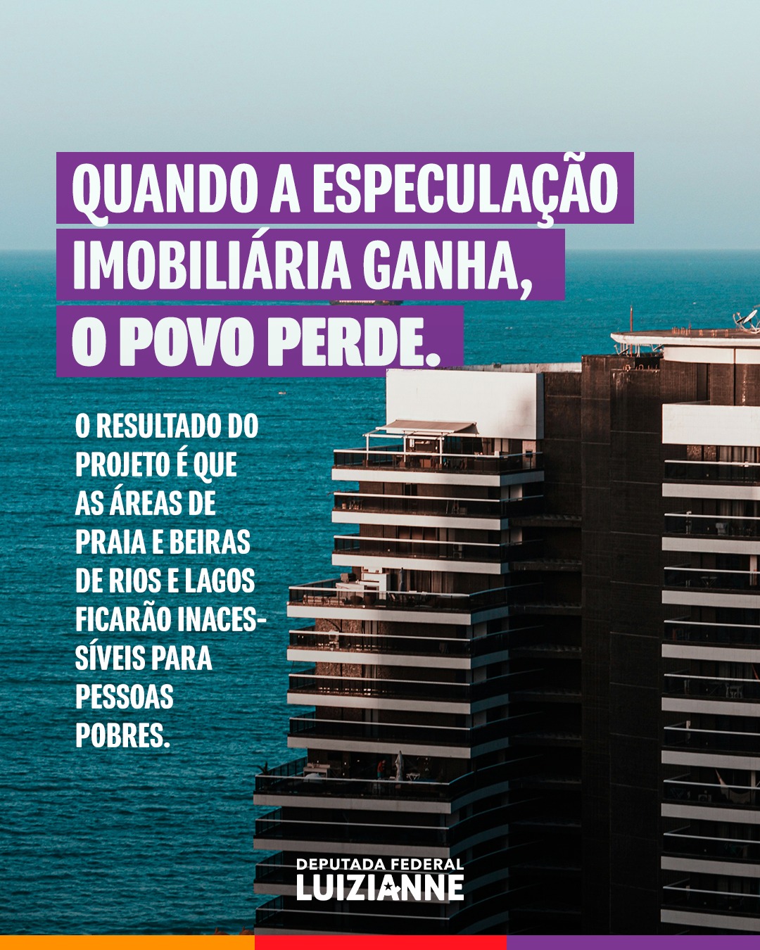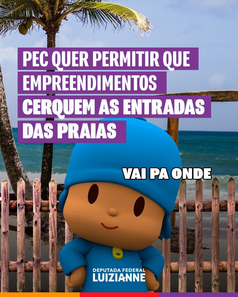 A deputada federal Luizianne Lins (PT/CE) vem denunciando a Proposta de Emenda à Constituição (PEC) nº 03/2022 que, na prática, resultará em privatização das faixas de praia e margens de rios. O relator da referida PEC no Senado é nada mais menos do que Flávio Bolsonaro, senador filho do ex-presidente do Brasil, cuja privatização do patrimônio brasileiro era uma de suas políticas prioritárias