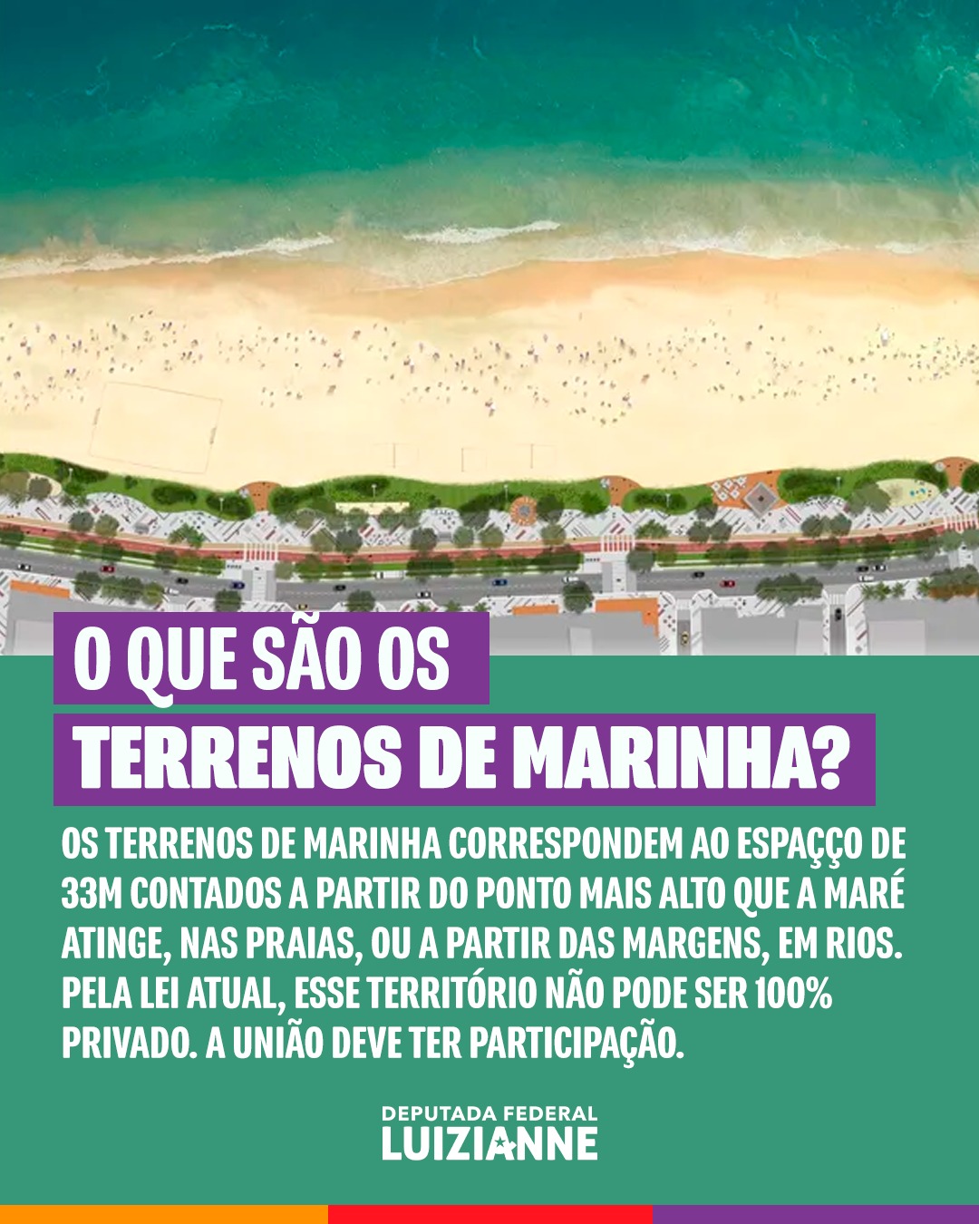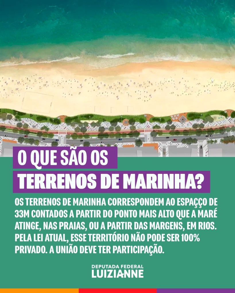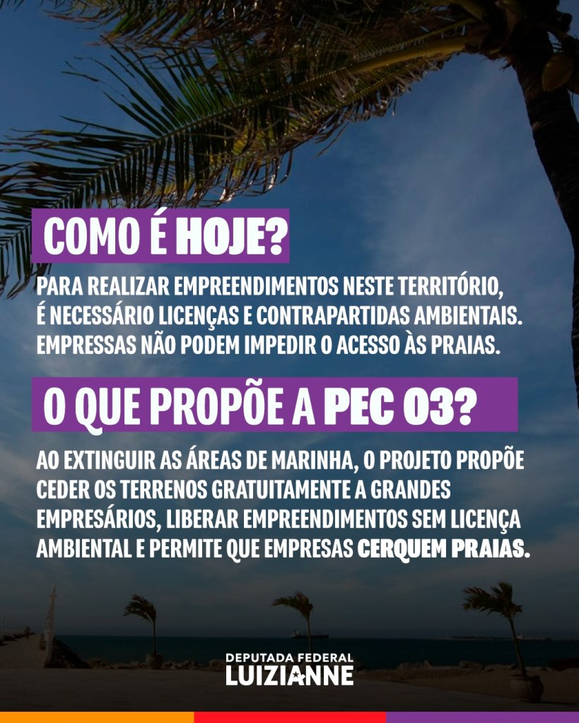 A proposta, de autoria do deputado federal Arnaldo Jordy (Cidadania/PA), já foi aprovada na Câmara. Em síntese, se aprovada, a Emenda permitirá a transferência dos terrenos de marinha gratuitamente aos seus ocupantes, quando estes forem os Estados ou Municípios, e mediante pagamento, quando ocupados por particulares. O que pode acontecer é que as pessoas que não têm condições econômicas poderão ter acesso proibido a essas áreas. “A PEC quer privatizar praias e margens de rios, abrindo espaço para mais segregação social e degradação ambiental”, afirma Luizianne em suas redes sociais da Internet.