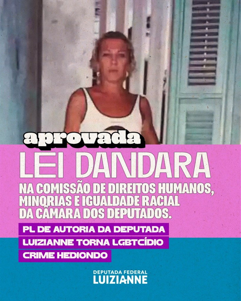O Projeto de Lei Dandara (nº7292/2017), de autoria da deputada federal Luizianne Lins (PT/CE), que qualifica como crime hediondo, no Código Penal, os homicídios motivados por LGBTfobia foi aprovado na Comissão de Direitos Humanos, Minorias e Igualdade Racial da Câmara Federal (CDHMIR), nesta quarta-feira (3/7).