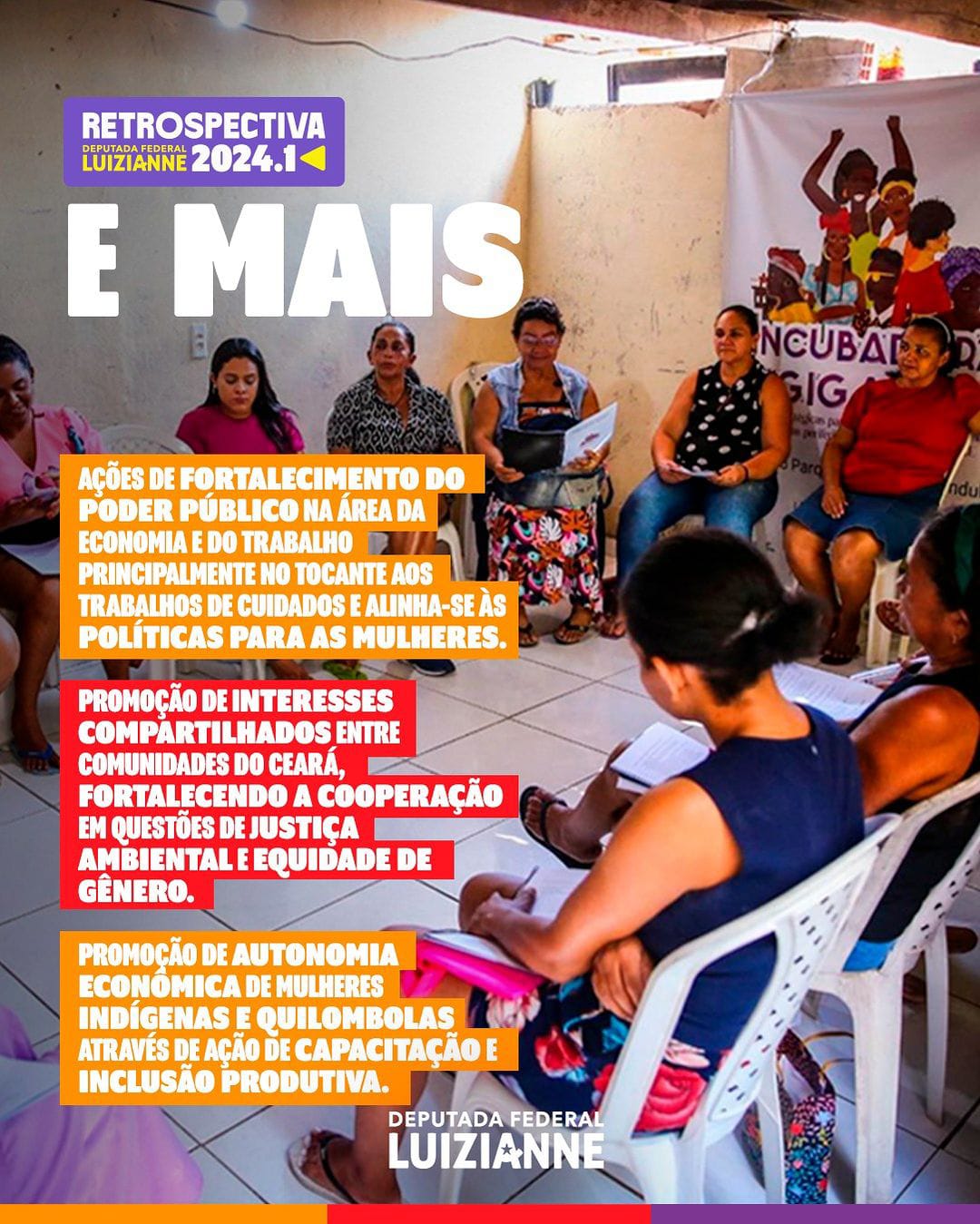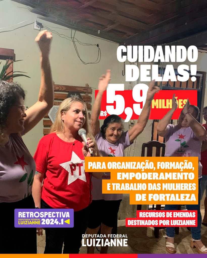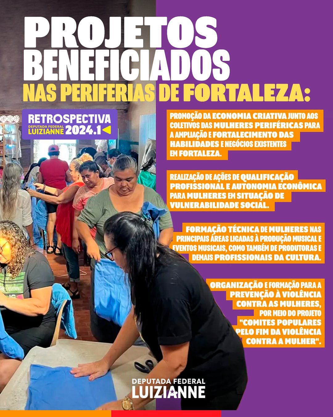 Apenas no primeiro semestre de 2024, a deputada federal Luizianne Lins (PT/CE) destinou R$ 5,9 milhões em recursos de emendas destinados à organização, formação, empoderamento e trabalho para mulheres em periferias de Fortaleza. Foram contemplados projetos para a promoção da economia criativa nos coletivos de mulheres periféricas, com o objetivo de ampliar e fortalecer as habilidades e negócios existentes.