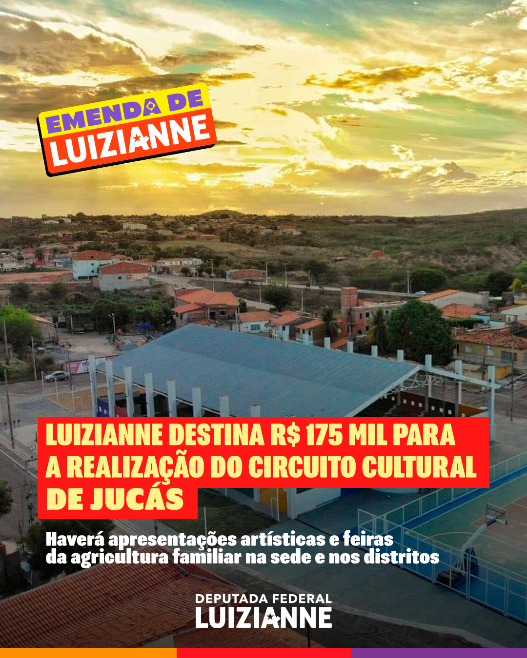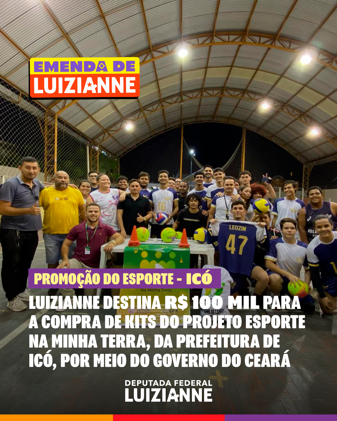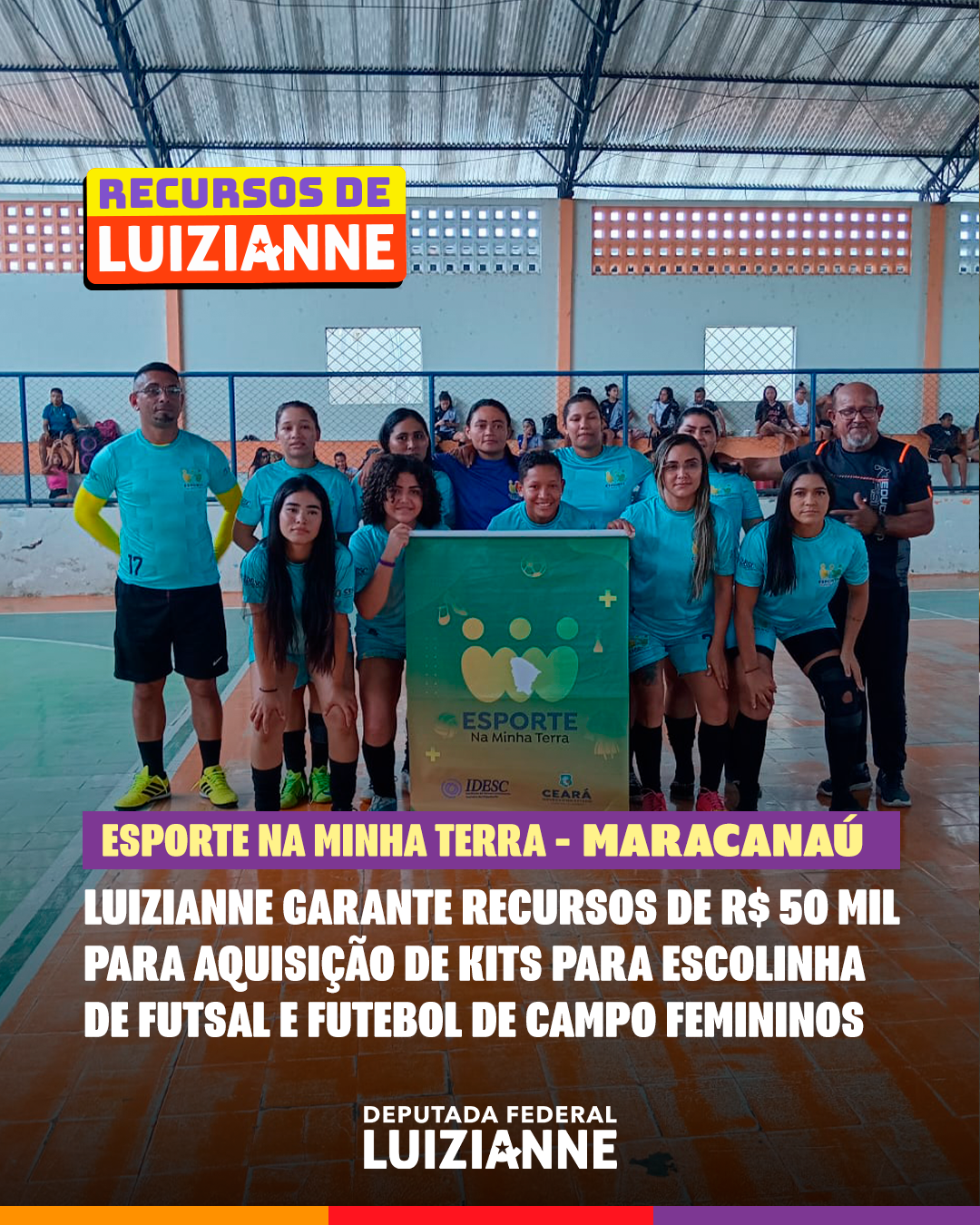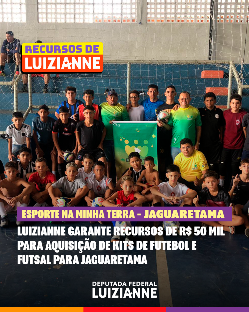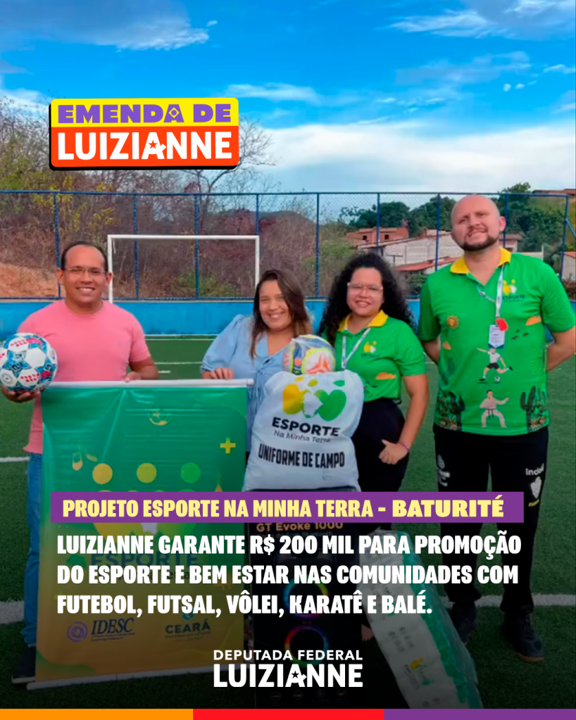 A deputada federal Luizianne Lins (PT/CE) garantiu a destinação de recursos, por meio do Governo do Ceará, para a compra de kits esportivos do projeto Esporte na Minha Terra, em municípios do Interior do Estado. O projeto é um apoio técnico e financeiro a ações de iniciativa comunitária no Estado, na perspectiva da promoção do Esporte, beneficiando, sobretudo, a juventude. Luizianne já assegurou recursos para Baturité, Icó, Jaguaretama, Jucás, Maracanaú e Paraipaba: