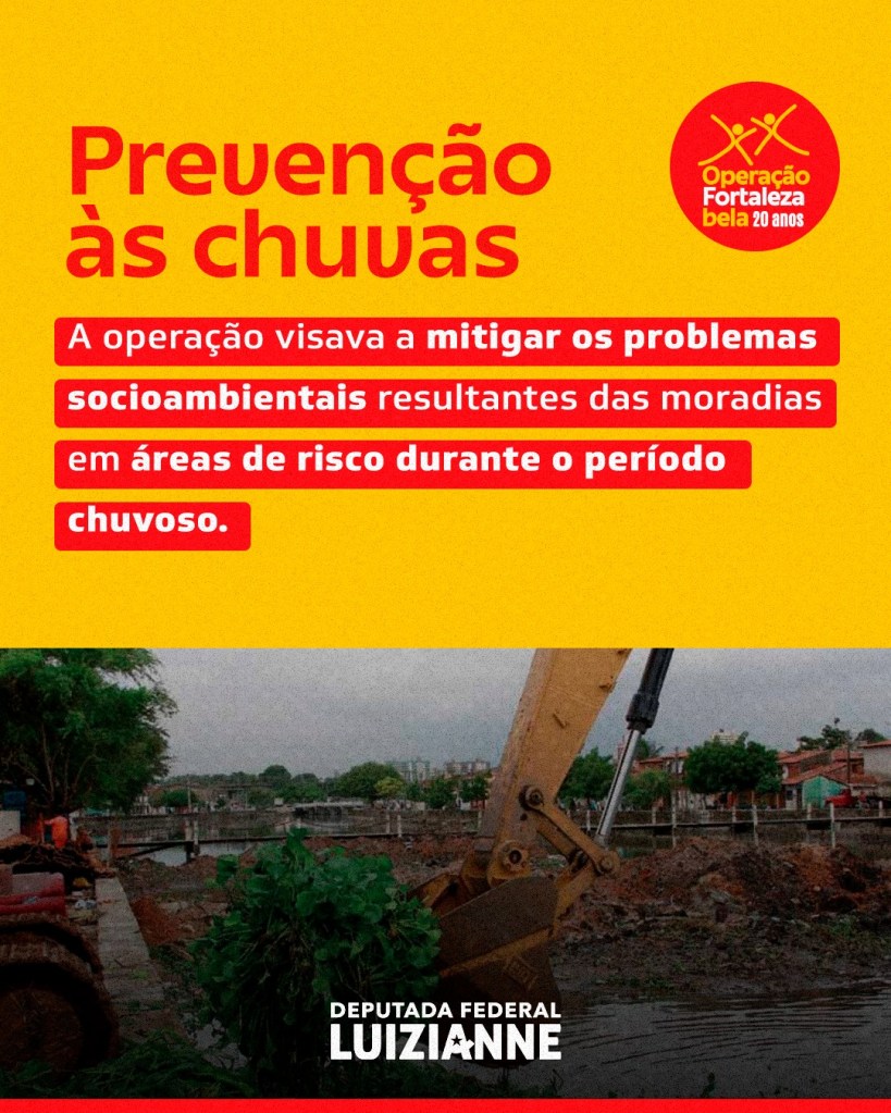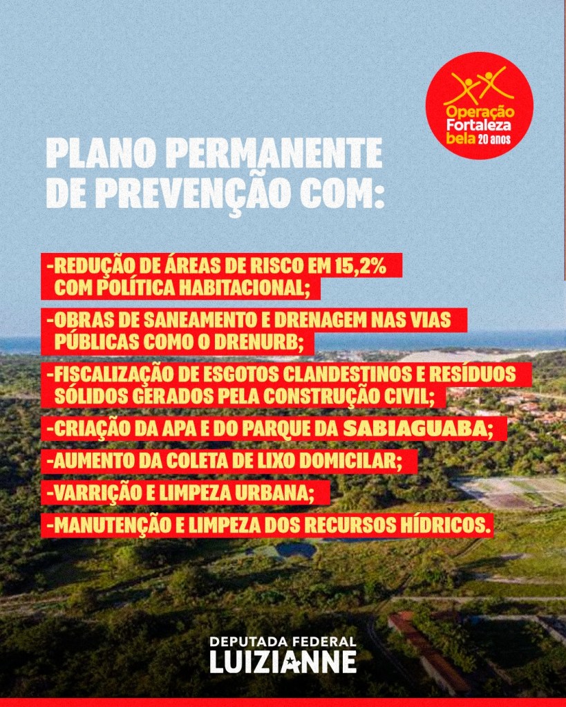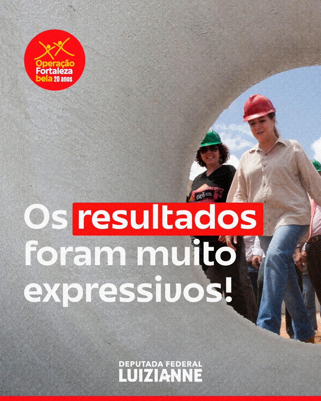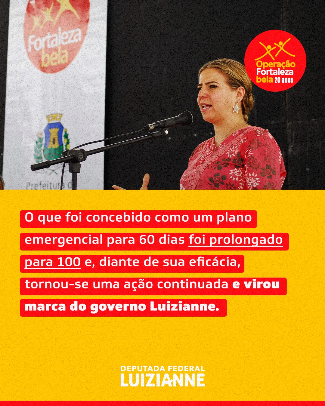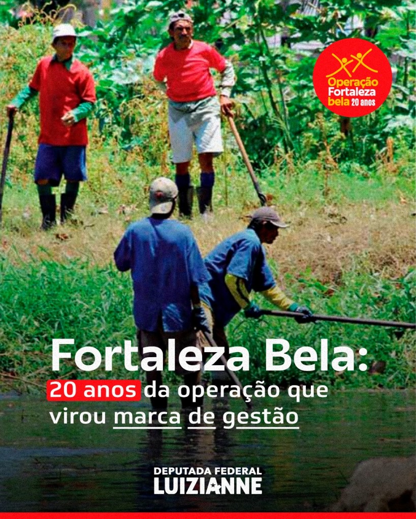 A deputada federal Luizianne Lins (PT/CE) fez divulgação em suas redes sociais da Internet em alusão aos 20 anos da Operação Fortaleza Bela, primeira iniciativa de Luizianne quando prefeita para melhorar a vida do povo da capital cearense. Quando assumiu a prefeitura, em 2005, Luizianne lançou a Operação Fortaleza Bela, em parceria com o Movimento Sem Terra (MST). A operação visava a mitigar os problemas socioambientais resultantes das moradias em áreas de risco durante o período chuvoso e, diante de sua eficácia, tornou-se uma ação continuada, virando marca do seu governo.