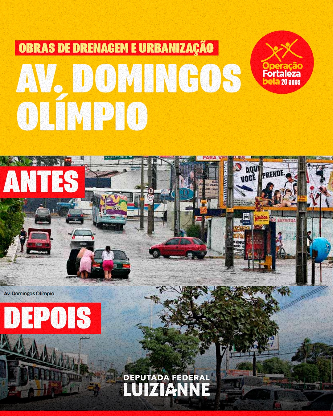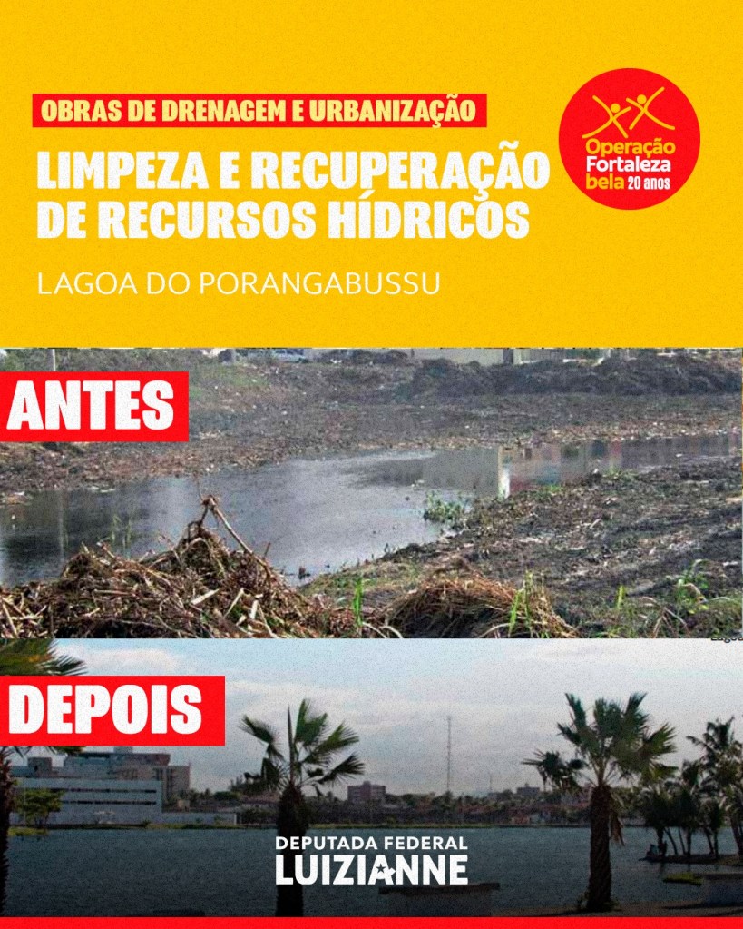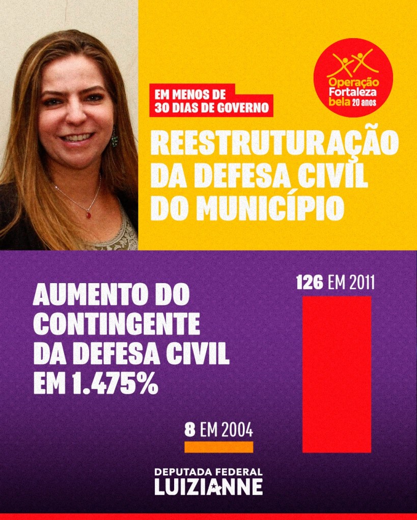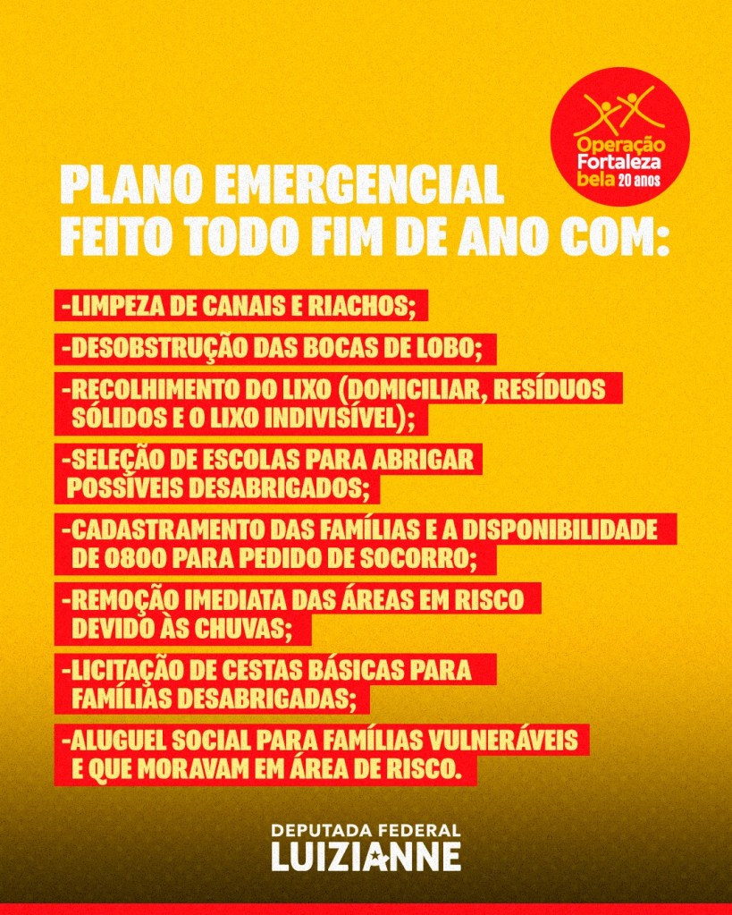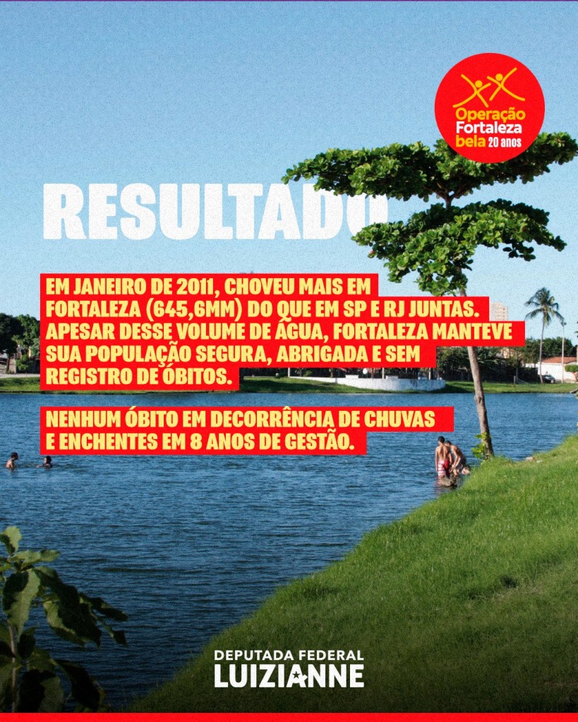 A deputada federal Luizianne Lins (PT/CE) fez divulgação em suas redes sociais da Internet em alusão aos 20 anos da Operação Fortaleza Bela, primeira iniciativa de Luizianne quando prefeita para melhorar a vida do povo da capital cearense. Quando assumiu a prefeitura, em 2005, Luizianne lançou a Operação Fortaleza Bela, em parceria com o Movimento Sem Terra (MST). A operação visava a mitigar os problemas socioambientais resultantes das moradias em áreas de risco durante o período chuvoso e, diante de sua eficácia, tornou-se uma ação continuada, virando marca do seu governo.