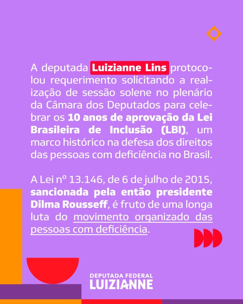A deputada Luizianne Lins protocolou requerimento solicitando a realização de sessão solene, no plenário da Câmara dos Deputados, para celebrar os 10 anos de aprovação da Lei Brasileira de Inclusão (LBI), marco histórico na defesa dos direitos das pessoas com deficiência no Brasil.