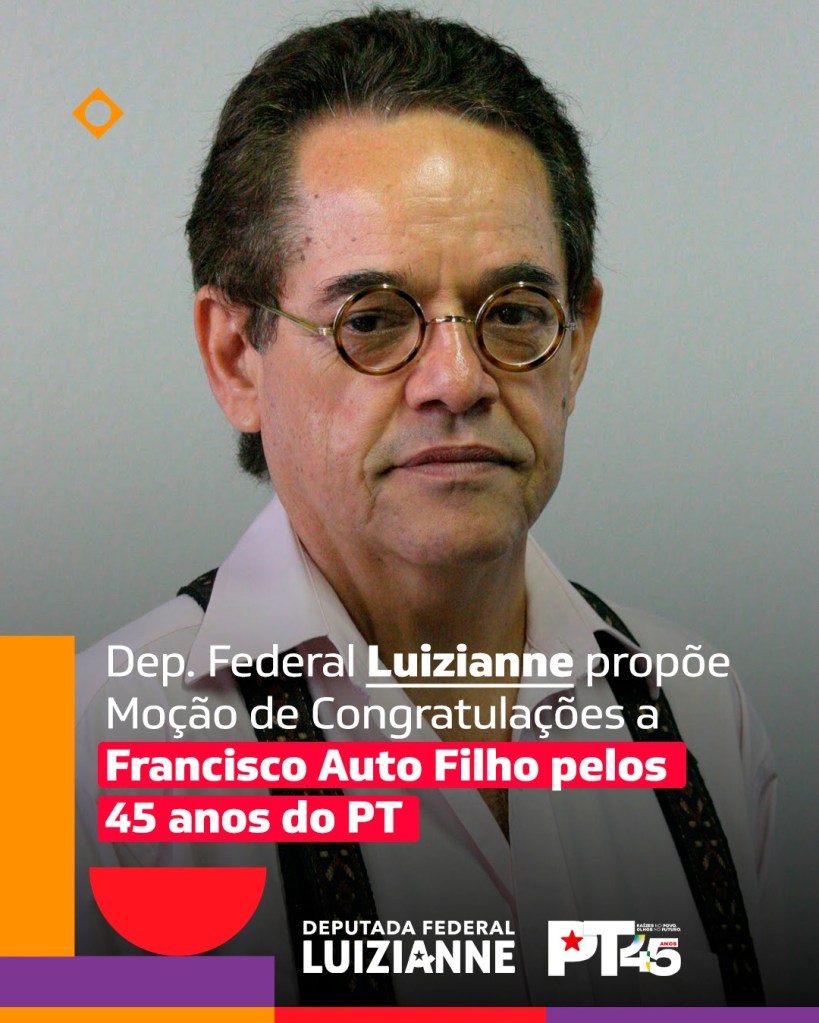 A deputada Luizianne Lins (PT-CE) apresentou, na Câmara dos Deputados, requerimento de Moção de Congratulações em homenagem a Francisco Auto Filho pelo 45º aniversário de fundação do Partido dos Trabalhadores (PT), celebrado em 10 de fevereiro de 2025.
