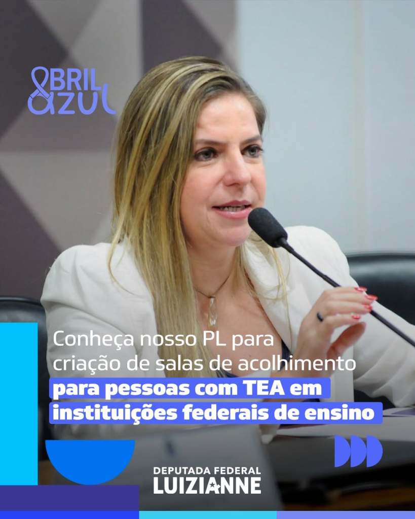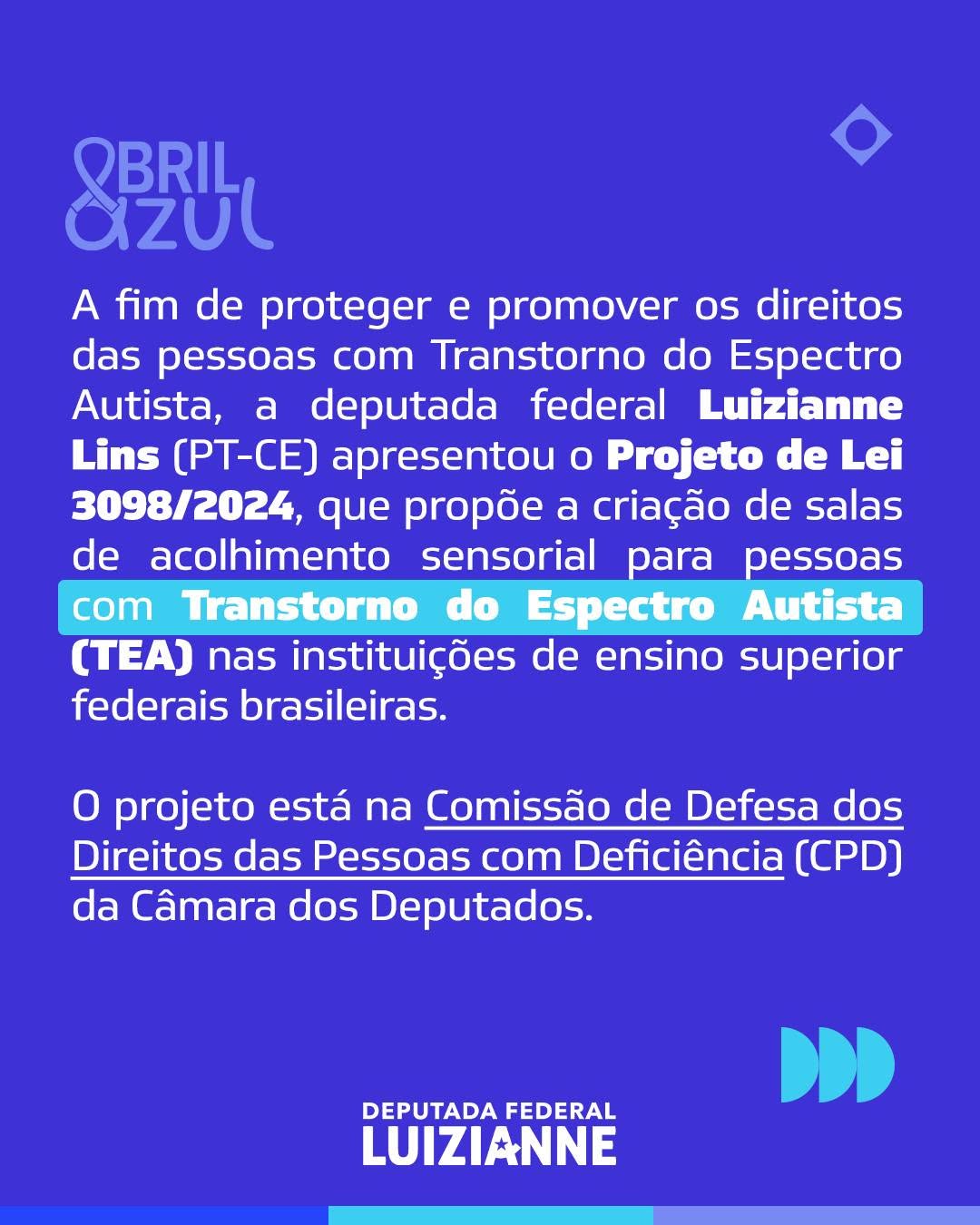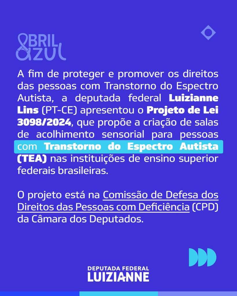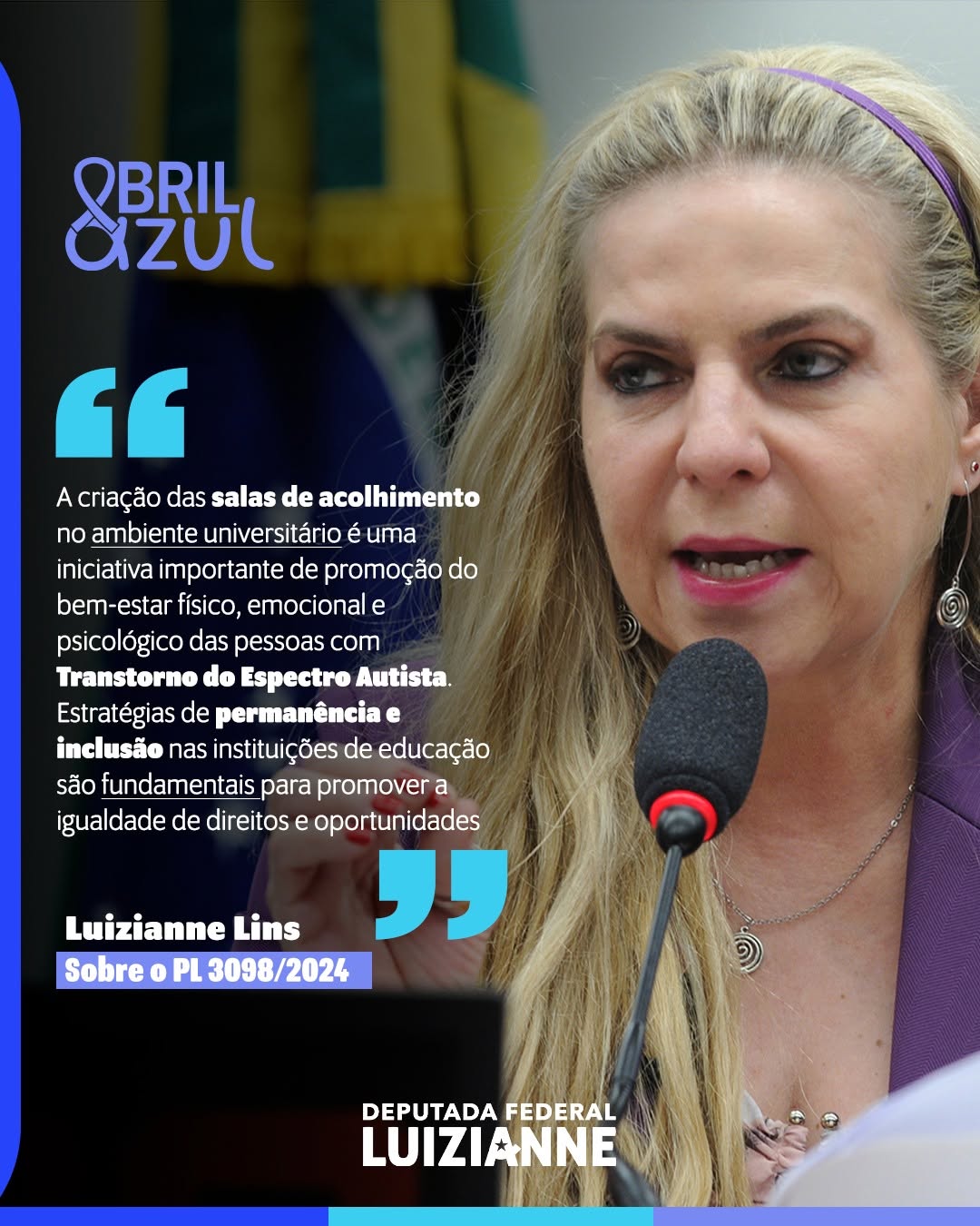 No dia 02 de abril, Dia Mundial da Conscientização sobre o Autismo, a deputada federal Luizianne Lins (PT) ressaltou a importância que sejam apresentadas proposições para melhorar a vida das pessoas com Transtorno do Especto Autista (TEA). Luizianne é autora, por exemplo, do Projeto de Lei (PL nº 3098/2024) que prevê a construção de espaços que proporcionem um ambiente seguro e confortável nas Instituições Federais de Ensino para pessoas com TEA, medida importante para materializar o PNAES (Plano Nacional de Assistência Estudantil), apoiando e ampliando as condições de permanência nas IES, além de promover, sobretudo, o bem-estar físico, emocional e psicológico das pessoas com TEA.