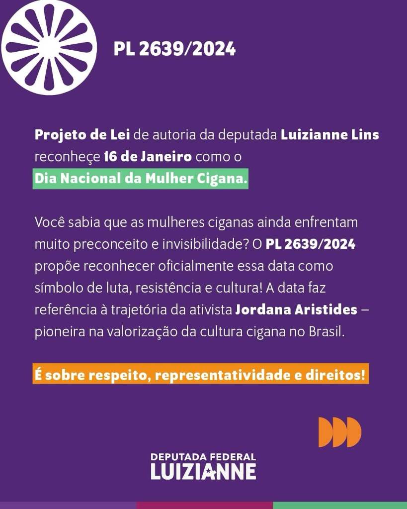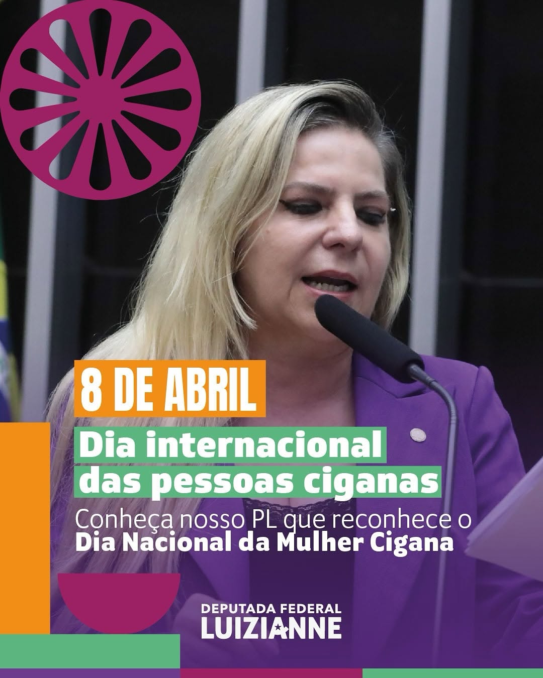 No Dia Internacional das Pessoas Ciganas, 08 de abril, a deputada federal Luizianne Lins (PT/CE) destacou a importância e a necessidade de reconhecimento e direitos desse segmento na sociedade. A parlamentar informou sobre o Projeto de Lei de sua autoria (PL nº 2639/2024), que institui o Dia Nacional da Mulher Cigana.