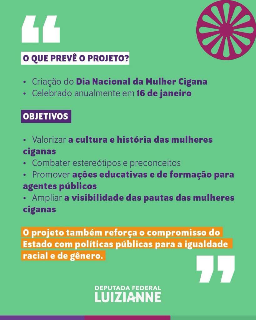 “A comemoração desta data certamente dará visibilidade a essa luta histórica, ressaltando a importância das mulheres cigana no mundo da cultura, do trabalho e da vida brasileira. Trata-se de uma tarefa premente ainda mais se considerarmos que as mulheres ciganas ainda são alvos constantes de práticas racistas e discriminatórias além de estarem, em suas maiorias, em situação socioeconômica marginalizada.”, afirma a justificativa do PL.