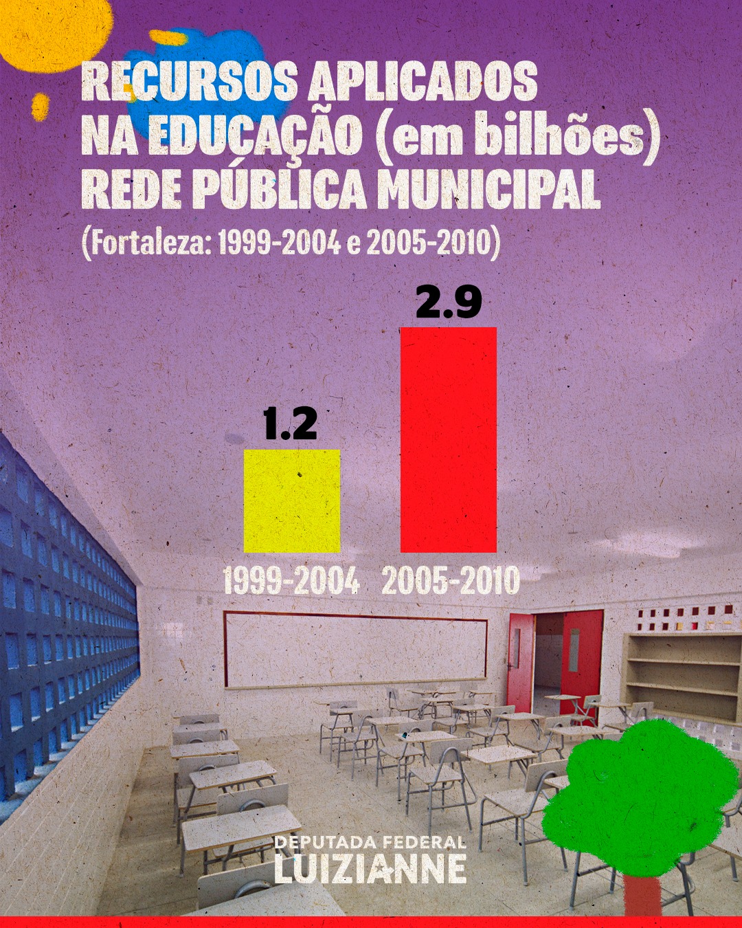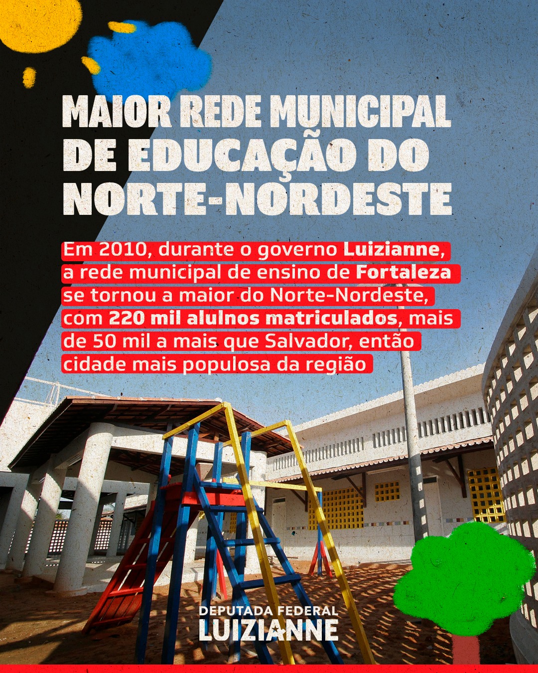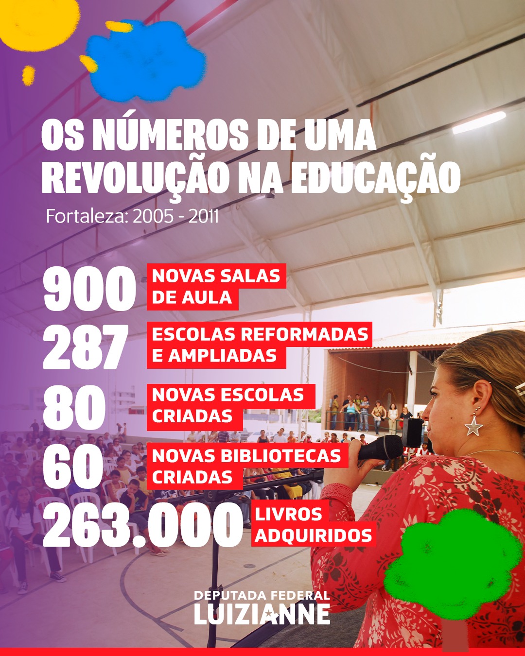 No Dia Internacional da Educação, 28/04, a deputada federal e ex-prefeita de Fortaleza, Luizianne Lins (PT/CE), relembrou, em suas redes sociais da Internet, os feitos históricos da gestão Fortaleza Bela na área da educação na capital cearense. “Nosso governo promoveu uma verdadeira revolução na educação da capital, com um salto na quantidade de escolas e na qualidade das estruturas das mesmas, fardamento completo e merenda de qualidade para as crianças, valorização de profissionais e mais que o dobro de investimentos da gestão anterior”, destacou a parlamentar. Confira: