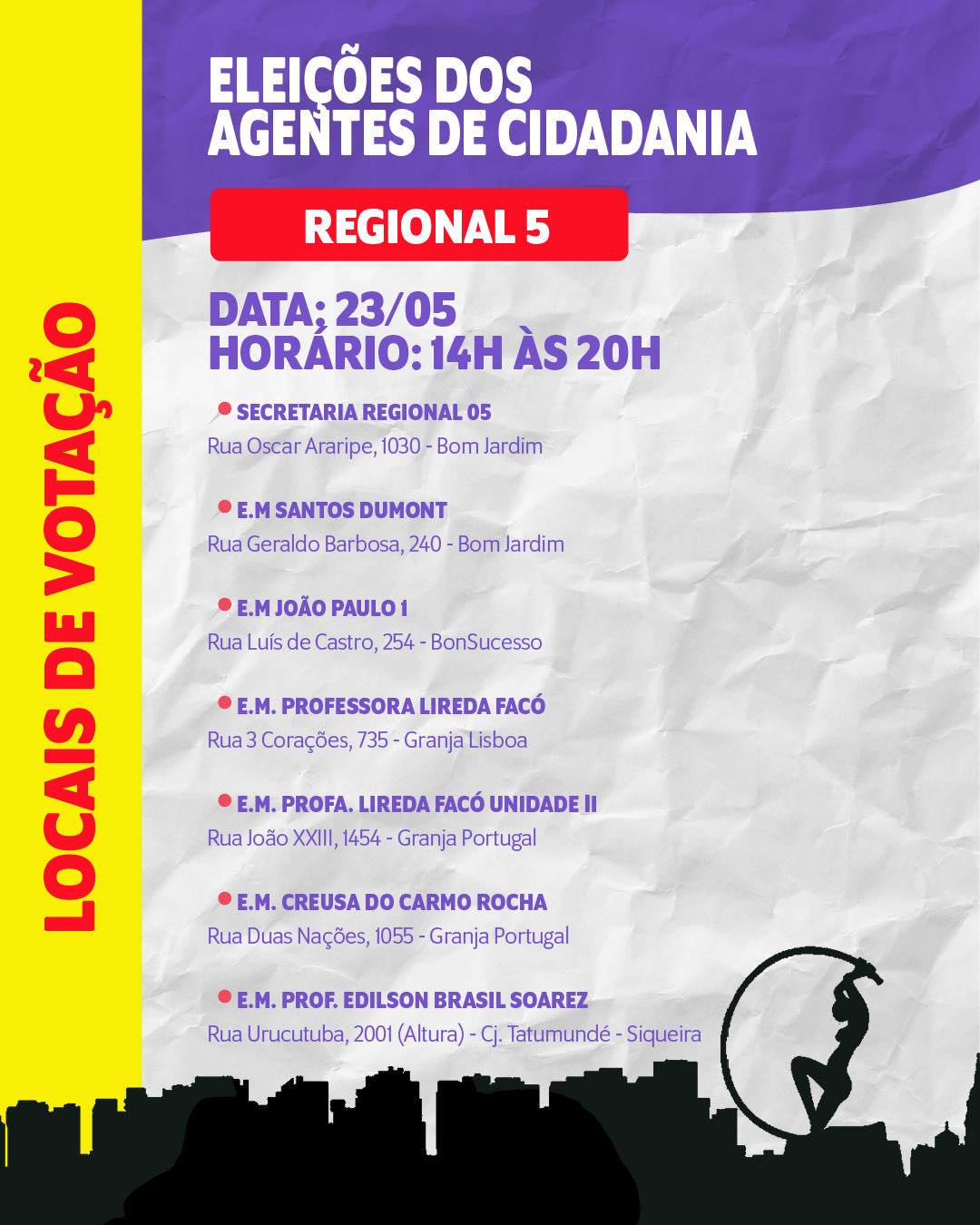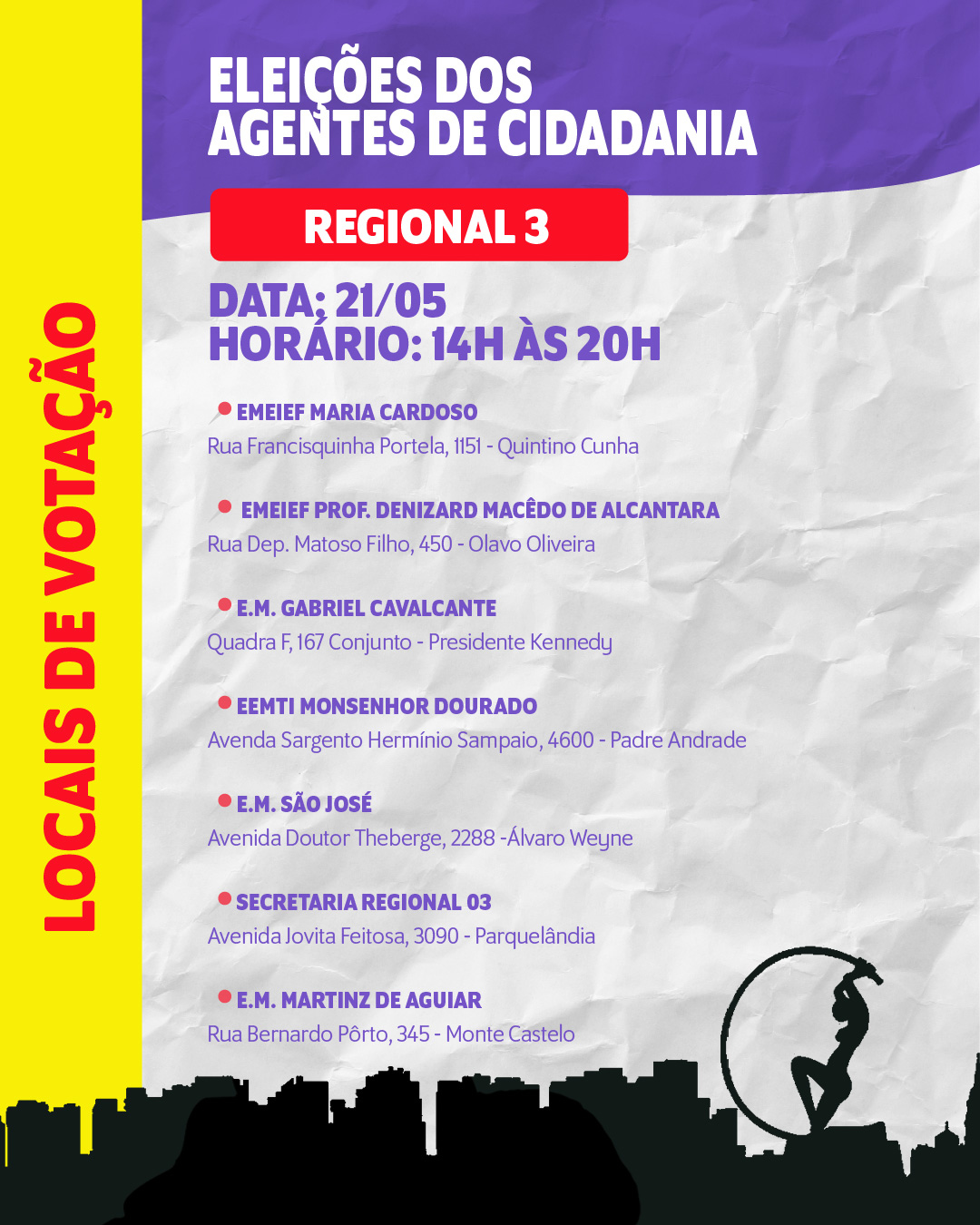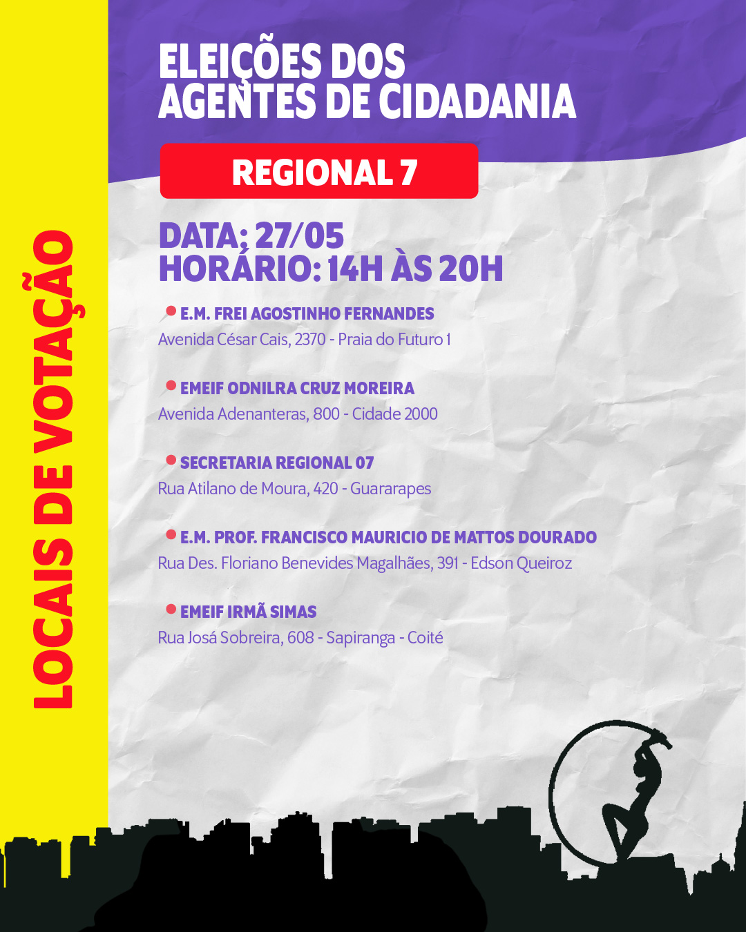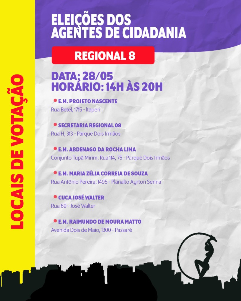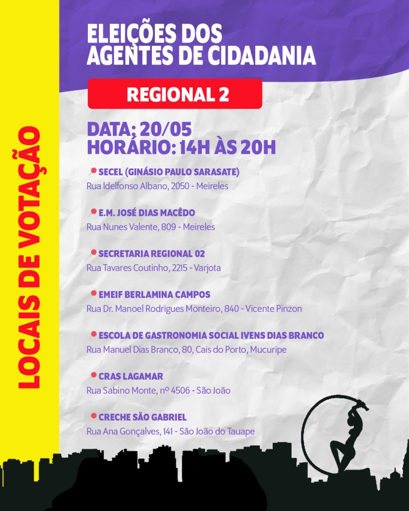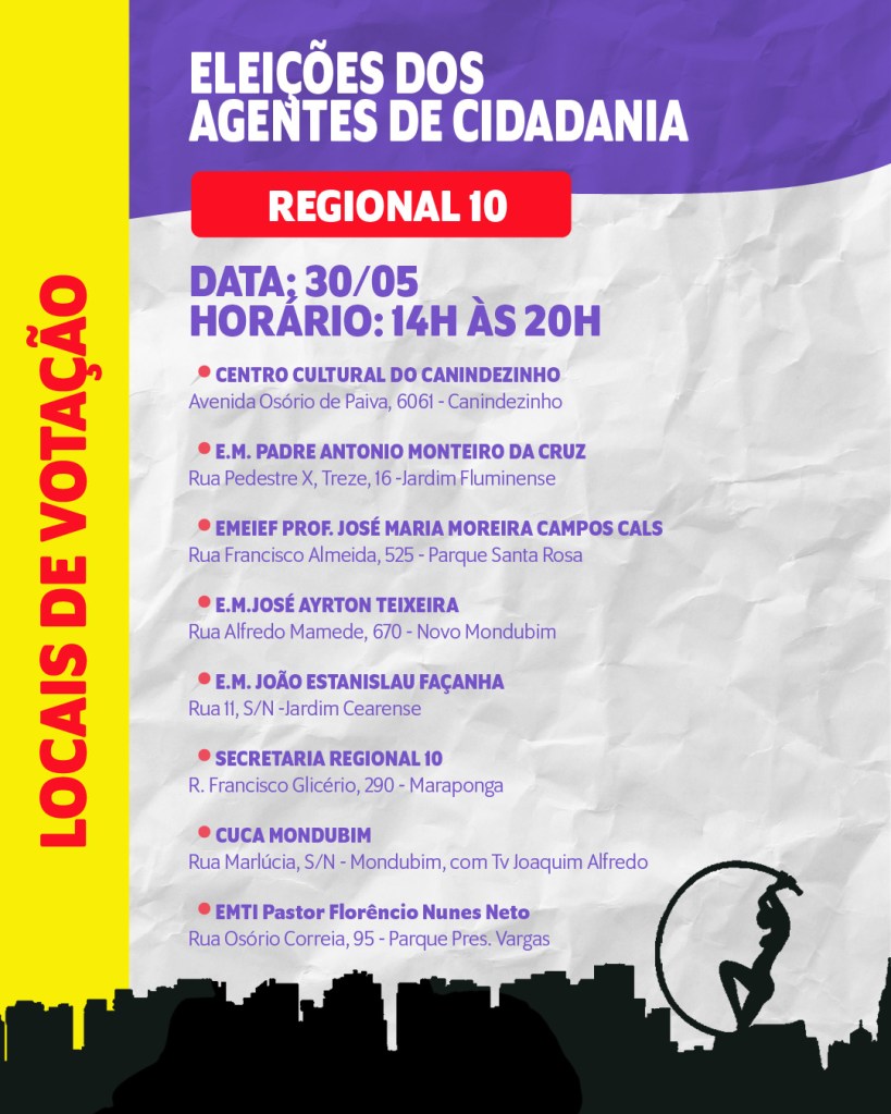 Locais e datas das eleições para agentes de Cidadania de Fortaleza 14 de maio de 2025 / Luizianne Lins Confira as datas e os locais de votação para agentes de cidadania e controle social nas 12 regionais de Fortaleza. Não deixe de votar! Compartilhe isso: Clique para compartilhar no X(abre em nova janela) 18+ Clique para compartilhar no Facebook(abre em nova janela) Facebook Clique para enviar um link por e-mail para um amigo(abre em nova janela) E-mail Clique para compartilhar no Pinterest(abre em nova janela) Pinterest Clique para compartilhar no LinkedIn(abre em nova janela) LinkedIn Clique para compartilhar no Tumblr(abre em nova janela) Tumblr Curtir Carregando... Relacionado