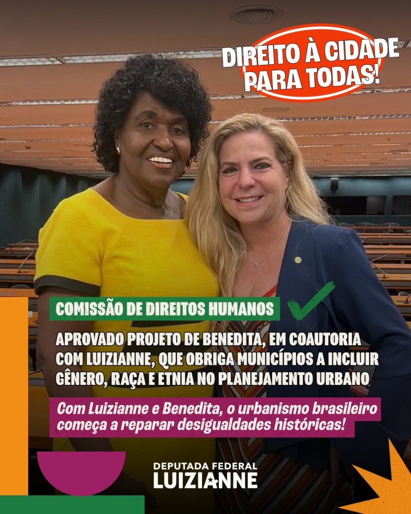 A Comissão de Direitos Humanos, Minorias e Igualdade Racial da Câmara dos Deputados aprovou a Inclusão de Gênero e Raça no Planejamento Urbano. O Projeto de Lei (PL n º 3637/2023), de autoria da deputada Benedita da Silva (PT-RJ) e coautoria da deputada Luizianne Lins (PT/CE), altera o Estatuto da Cidade para incluir recortes de gênero, raça e etnia em políticas urbanas, garantindo diretrizes como transporte seguro e creches em planos diretores municipais.
