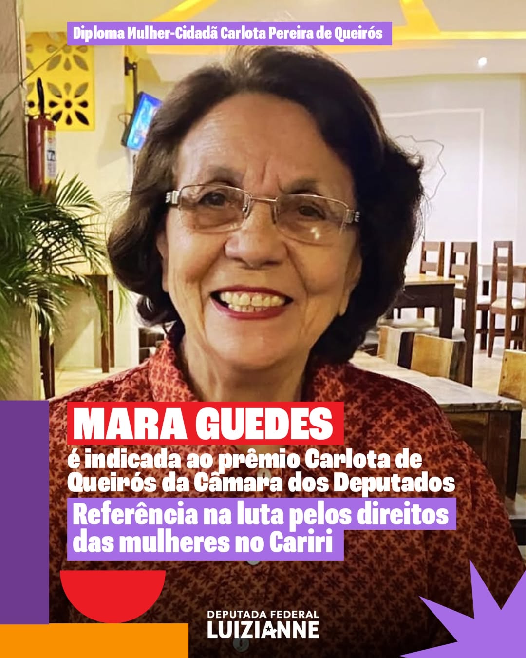 A deputada federal Luizianne Lins (PT/CE) indicou Mara Guedes, coordenadora da Casa da Mulher Cearense do Cariri, ao Diploma Mulher-Cidadã Carlota Pereira de Queirós, concedido pela Câmara dos Deputados a mulheres que se destacam na luta pelos direitos das mulheres no Brasil.