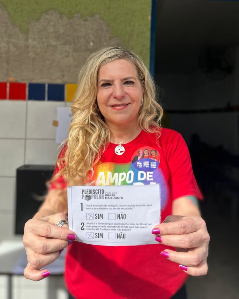 A deputada federal Luizianne Lins (PT/CE) votou no plebiscito popular pelo fim da Escala 6×1 e a Taxação dos super ricos. Este plebiscito popular é uma iniciativa dos movimentos sociais, centrais sindicais, juventudes, artistas e partidos progressistas para que a população faça valer a sua voz na luta por direitos, justiça tributária e social.