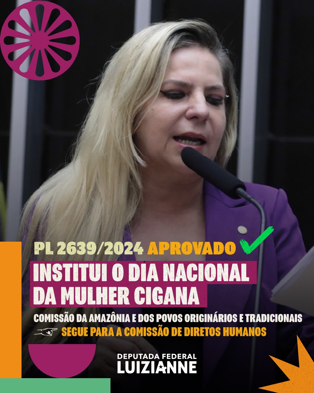 Foi aprovado na Comissão da Amazônia e dos Povos Originários e Tradicionais da Câmara o Projeto de Lei (PL nº 2639/2024), de autoria da deputada federal Luizianne Lins (PT/CE), que institui 16 de janeiro como o Dia Nacional da Mulher Cigana. A proposta foi construída a partir de uma articulação com a Rede Brasileira dos Povos Ciganos-RBPC. O texto está agora na Comissão de Direitos Humanos, Minorias e Igualdade Racial.