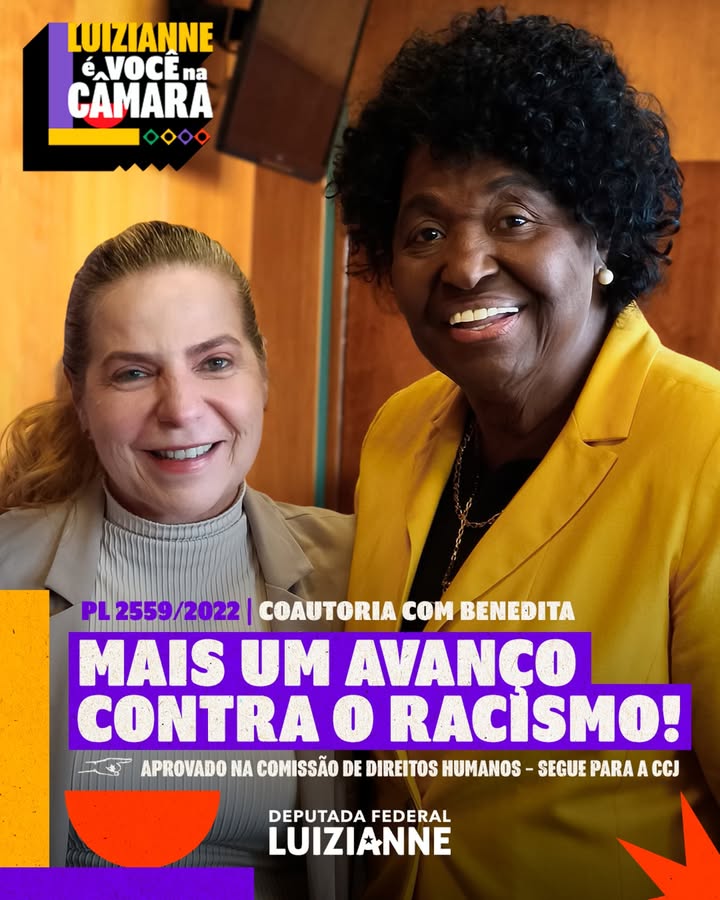 Vitória importante! O Projeto de Lei 2559/22, aprovado na Comissão de Direitos Humanos, de auoria da deputada federal Benedita da Silva (PT/RJ) e coautoria da deputada federal Luizianne Lins (PT/CE) garante que crimes de racismo não sejam tratados com instrumentos que enfraquecem a responsabilização.