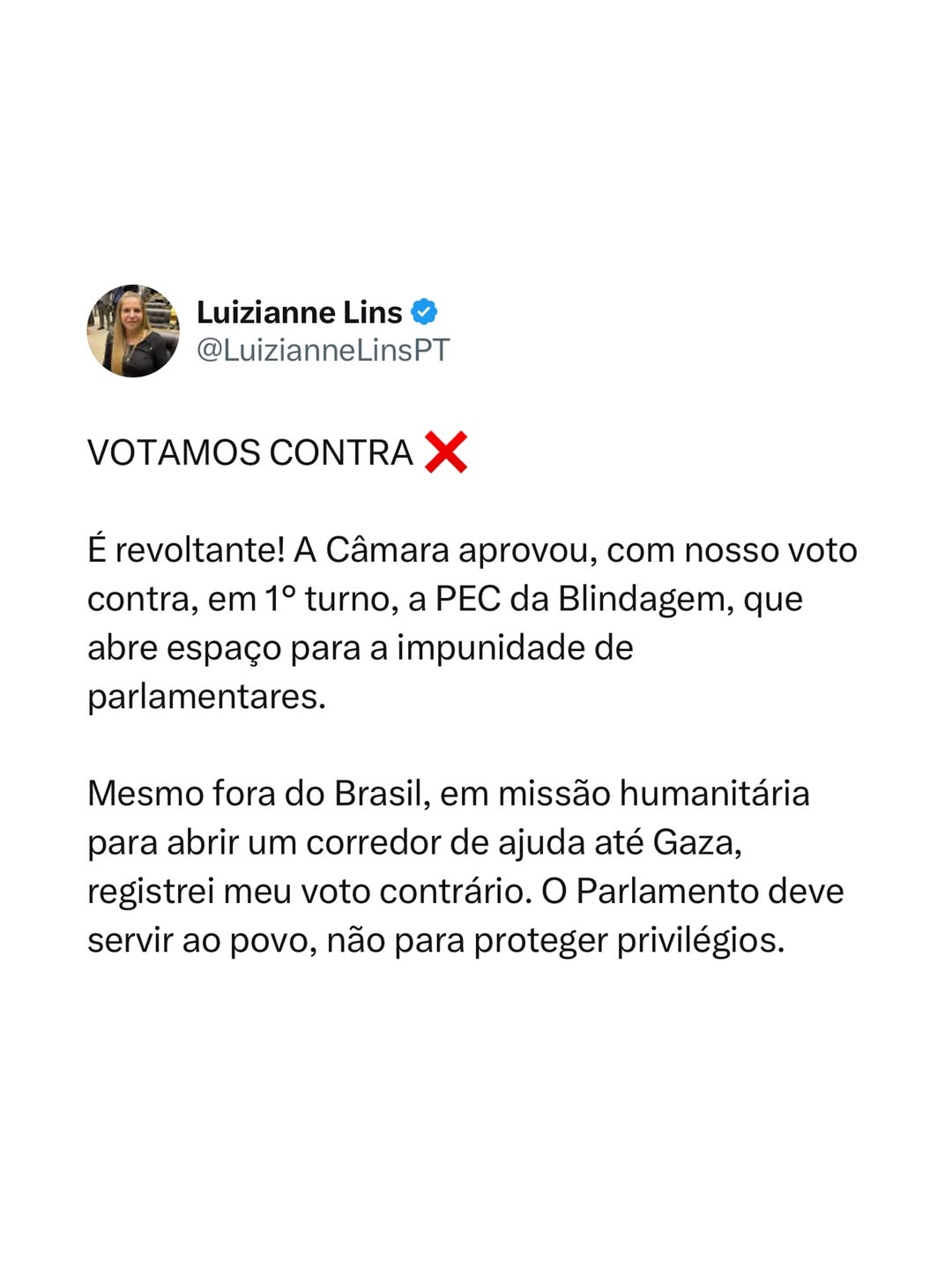 Diretamente do Mar Mediterrâneo, onde integra a Global Sumud Flotilha em Missão Oficial pela Câmara dos Deputados, a deputada federal Luizianne Lins (PT/CE) vou online contra a chamada PEC da Blindagem. “Assustou-nos a quantidade de deputados(as) que votaram favoravelmente à PEC da blindagem – da impunidade dos parlamentares. Essa medida é meramente corporativa, onde são priorizados os próprios interesses dos deputados”, afirmou a parlamentar em suas redes sociais da Internet.