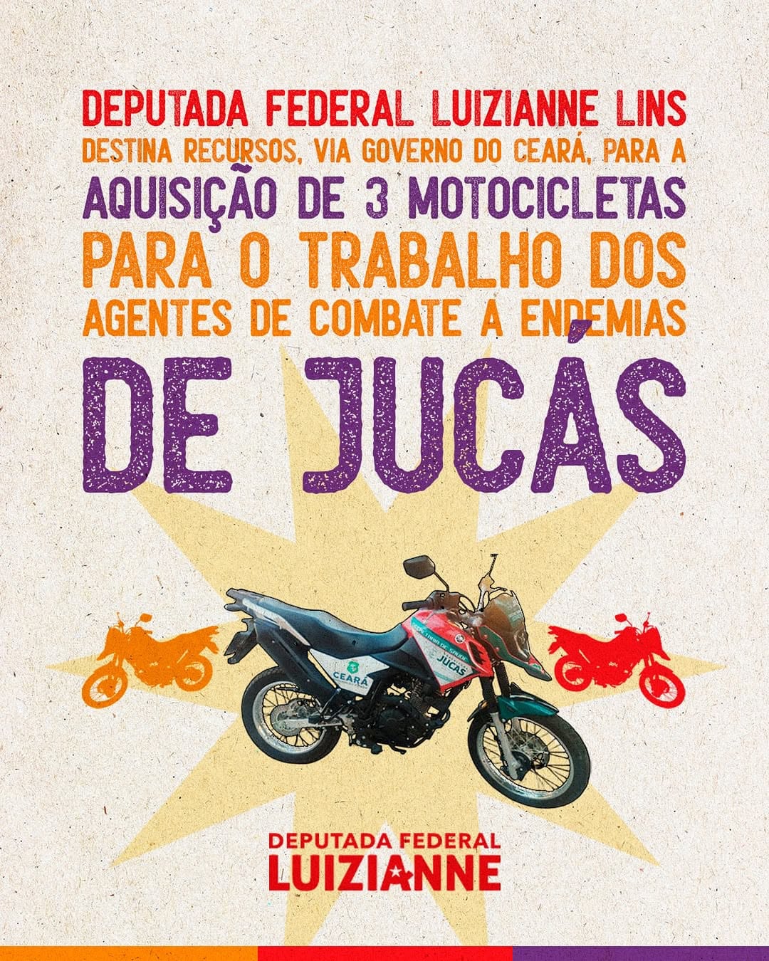 A deputada federa Luizianne Lins (PT/CE) destinou recursos, via Governo do Ceará, para a aquisição de três motocicletas destinadas ao trabalho dos agentes de endemias de Jucás. Mais um resultado da parceria do mandato de Luizianne com o vereador do PT de Jucás Ernaldo de Carvalho.
