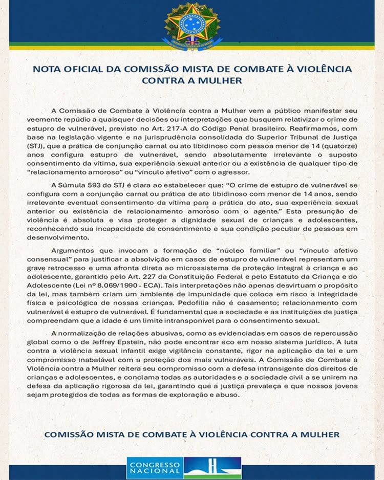 Como presidente da Comissão Mista de Combate à Violência contra a Mulher do Congresso Nacional, a deputada federal Luizianne Lins divulgou nota de repúdio da comissão à decisão do TJ/MG que relativizou a violência sexual contra crianças e adolescentes. A comissão também aprovou uma série de requerimentos para debater o combate à violência contra mulheres e meninas.