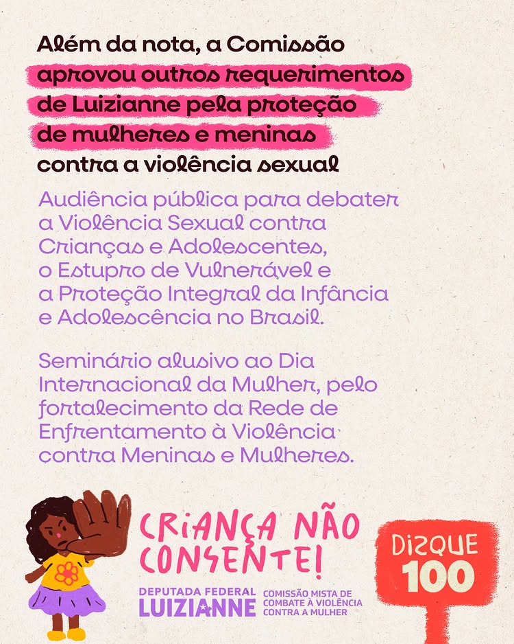 Como presidente da Comissão Mista de Combate à Violência contra a Mulher do Congresso Nacional, a deputada federal Luizianne Lins divulgou nota de repúdio da comissão à decisão do TJ/MG que relativizou a violência sexual contra crianças e adolescentes. A comissão também aprovou uma série de requerimentos para debater o combate à violência contra mulheres e meninas.