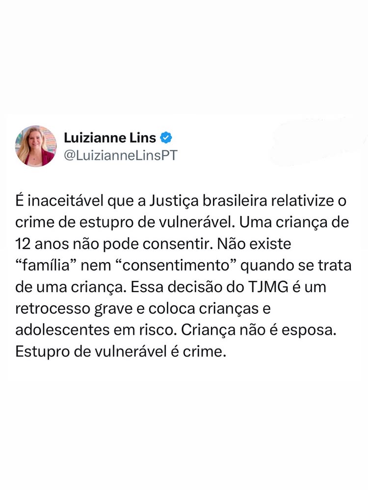 A deputada federal Luizianne Lins, presidente da Comissão de Combate à Violência contra a Mulher (CMCVM) da Câmara e Senado, manifestou seu repúdio ao caso do homem de 35 anos que vive junto com uma menina de 12 anos em Minas Gerais. “É inaceitável que a Justiça brasileira relativize o crime de estupro de vulnerável. Uma criança de 12 anos não pode consentir. Não existe “família” nem “consentimento” quando se trata de uma criança. Essa decisão do TJMG é um retrocesso grave e coloca crianças e adolescentes em risco. Criança não é esposa. Estupro de vulnerável é crime”, afirmou a parlamentar.