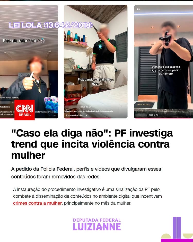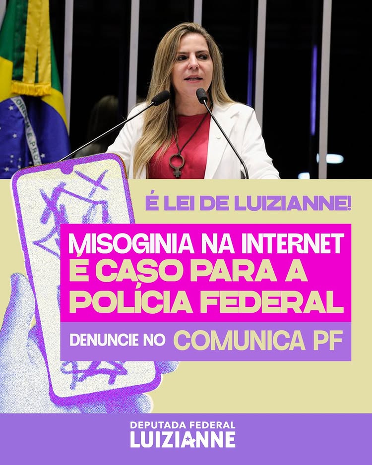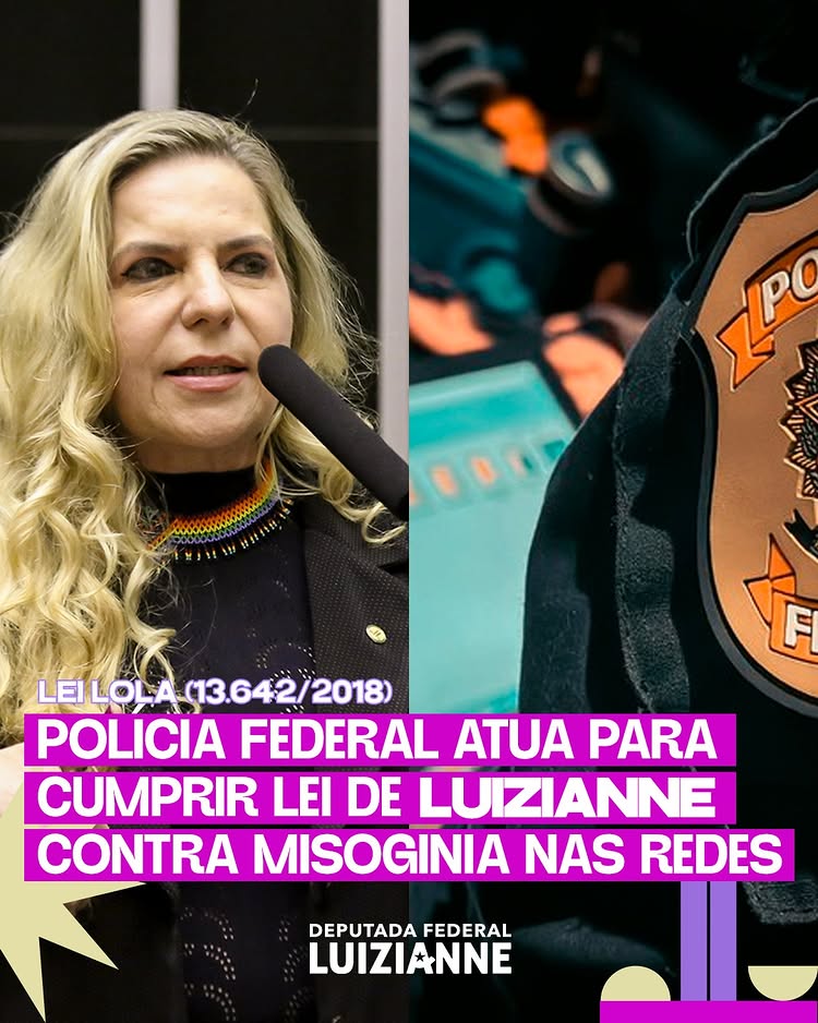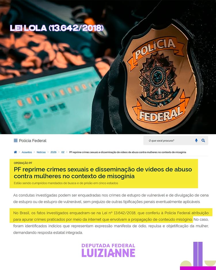 A Polícia Federal tem atuado para cumprir lei (13.642/2018) de autoria da deputada federal Luizianne Lins, presidente da Comissão Mista de Combate à Violência contra a Mulher (CMCVM) do Congresso Nacional (Câmara e Senado), conhecida como Lei Lola, para combater crimes de misoginia no ambiente digital.