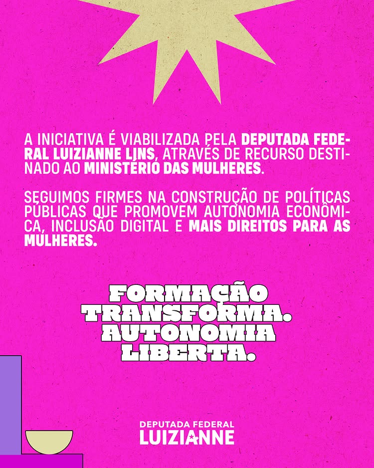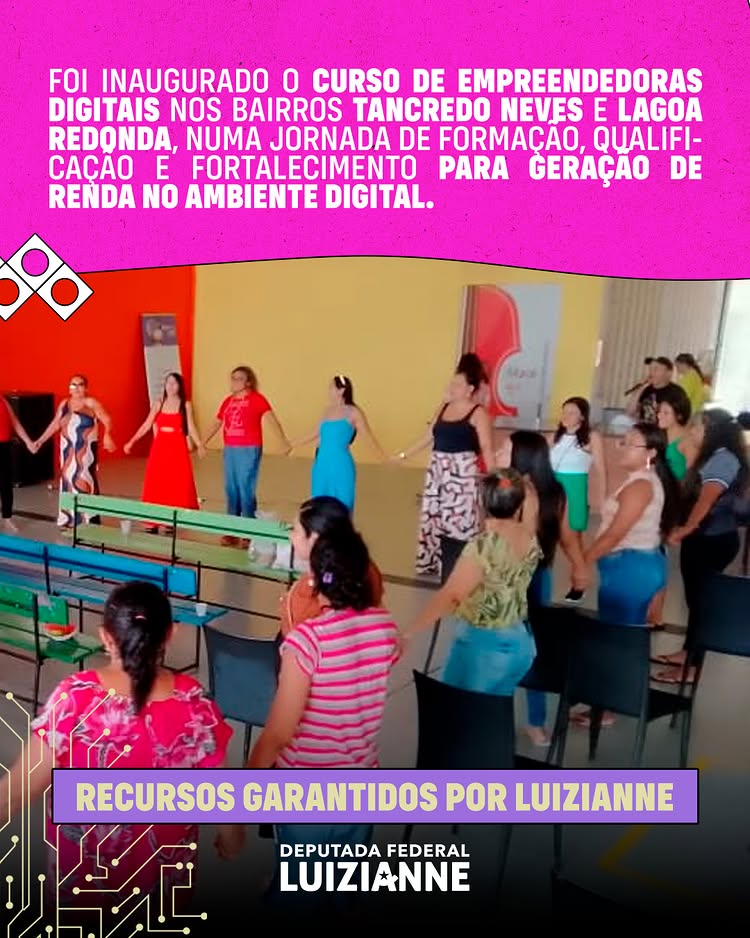 Mulheres participam de curso de Empreendedoras Digitais com recursos destinados por Luizianne 14 de abril de 2026 / Luizianne Lins Com recursos viabilizados pela deputada federal e ex-prefeita de Fortaleza, Luizianne Lins, mulheres dos bairros Tancredo Neves e Lagoa Redonda, em Fortaleza, estão realizando o curso Mulheres Empreendedoras Digitais. Compartilhe isso: Compartilhar no X(abre em nova janela) 18+ Compartilhar no Facebook(abre em nova janela) Facebook Envie um link por e-mail para um amigo(abre em nova janela) E-mail Compartilhar no Pinterest(abre em nova janela) Pinterest Compartilhar no LinkedIn(abre em nova janela) LinkedIn Compartilhar no Tumblr(abre em nova janela) Tumblr Curtir Carregando... Relacionado